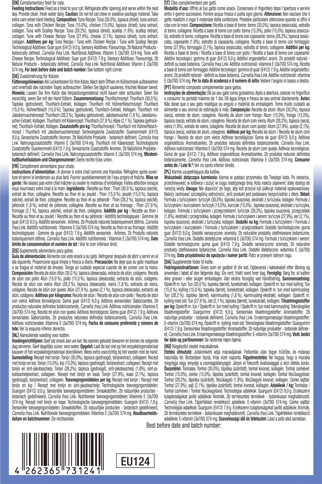 28,2 % Thunfisch, 1,8 % Jakobsmuscheln, Tapioka, Jakobsmuschel-Extrakt, Kollagen, Grüntee Extrakt