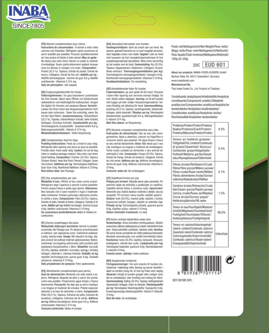 32 % Huhn, Tapioka, Hühnerfleisch-Extrakt, Hefe, Kollagen, Grüntee Extrakt, Guarkernmehl