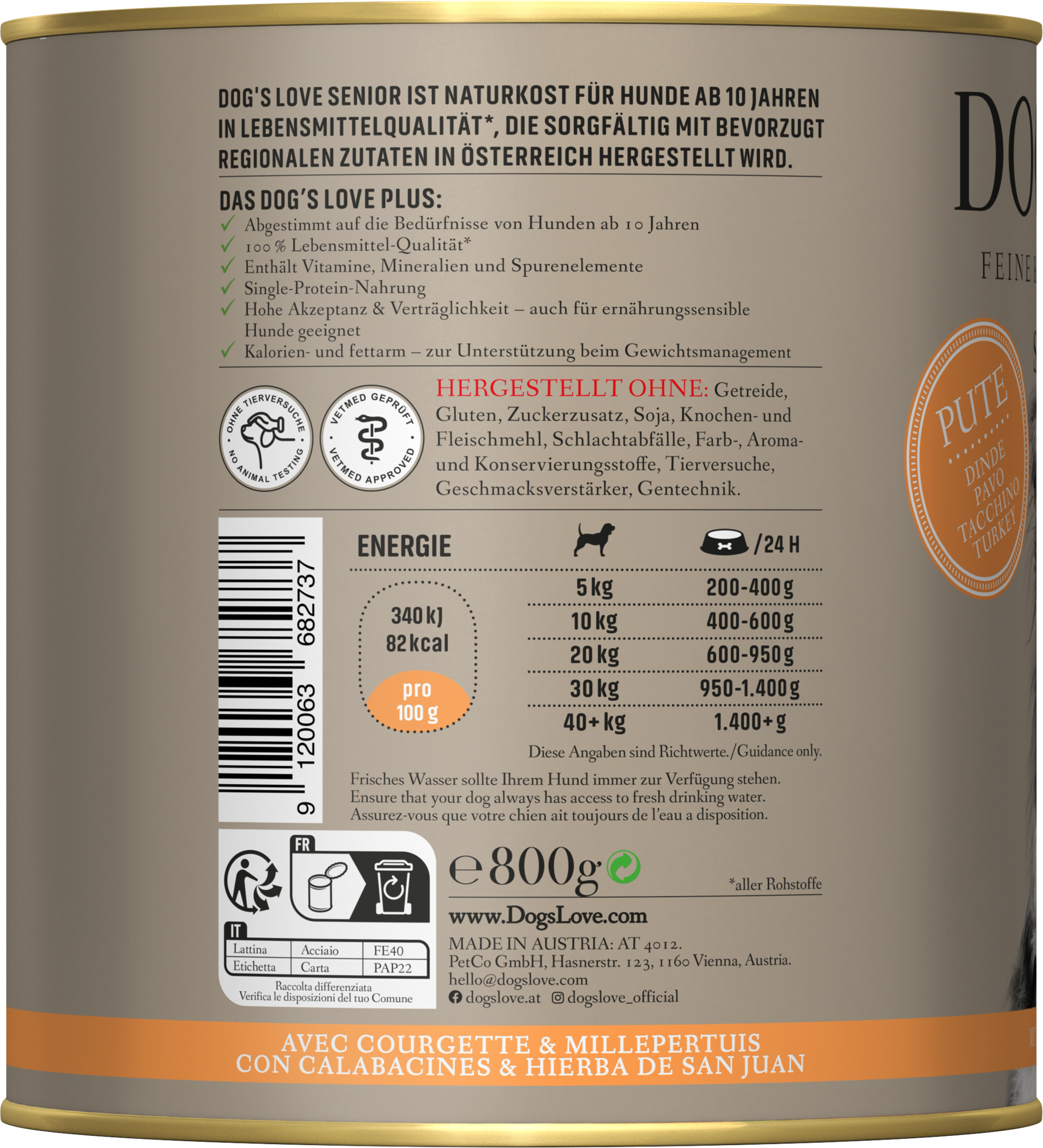 DOG'S LOVE Hundefutter Senior Pute, 800 g
