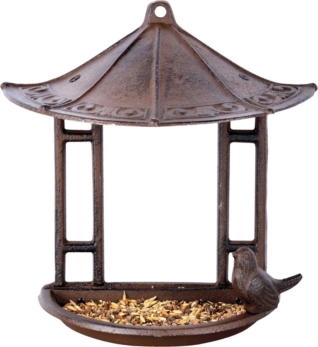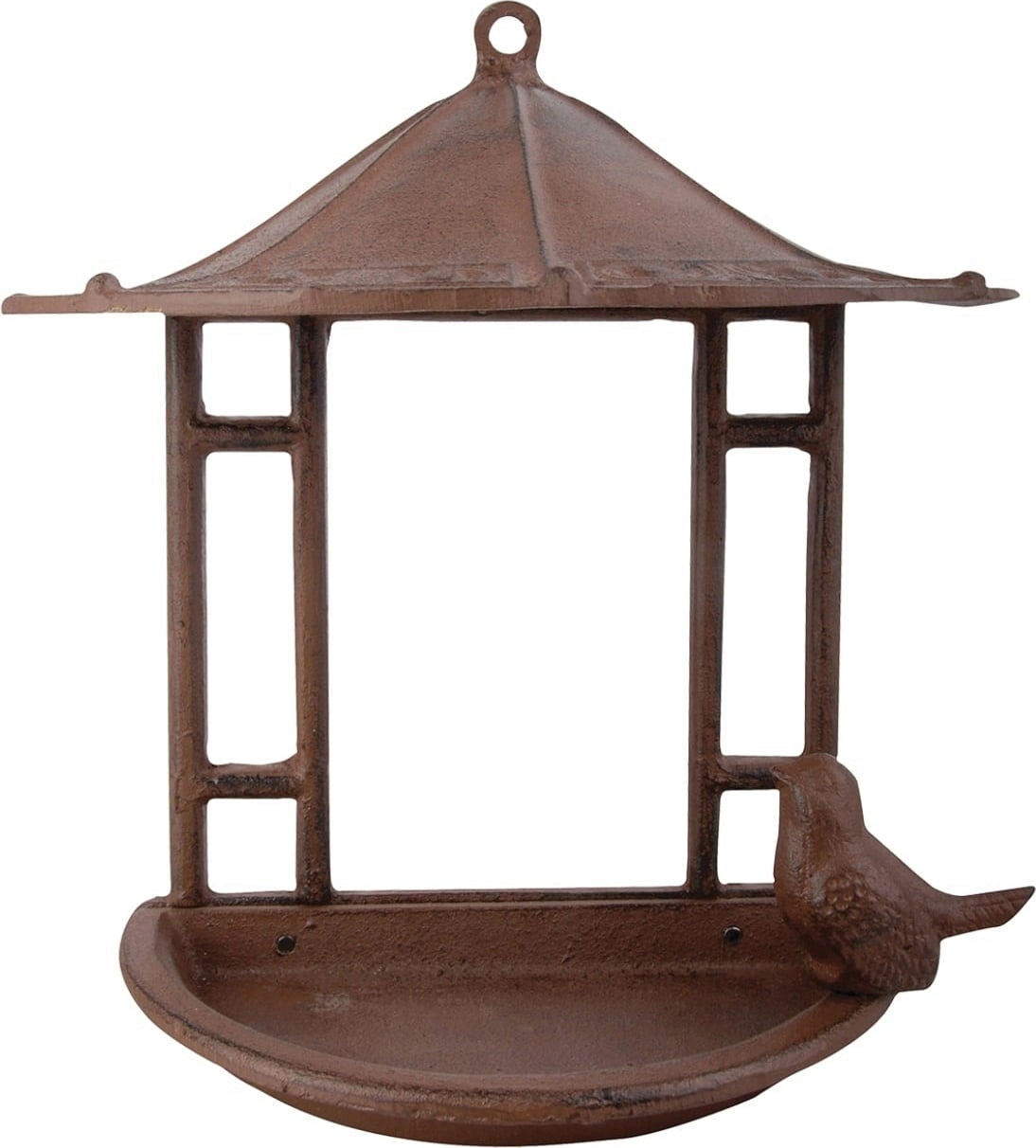 Dieses reizende Vogelfutterhaus aus stabilem Gusseisen ist mit einem Dach ausgestattet, welches das Futter vor Regen schützt. Die offene Form erleichtert es den Vögeln, das Häuschen anzufliegen und am Rand Platz zu nehmen. Mit seiner flachen Rückseite kann es in erhöhter Lage an einer Wand montiert werden und bietet dadurch einen sicheren Ort für ein entspanntes Mahl.
