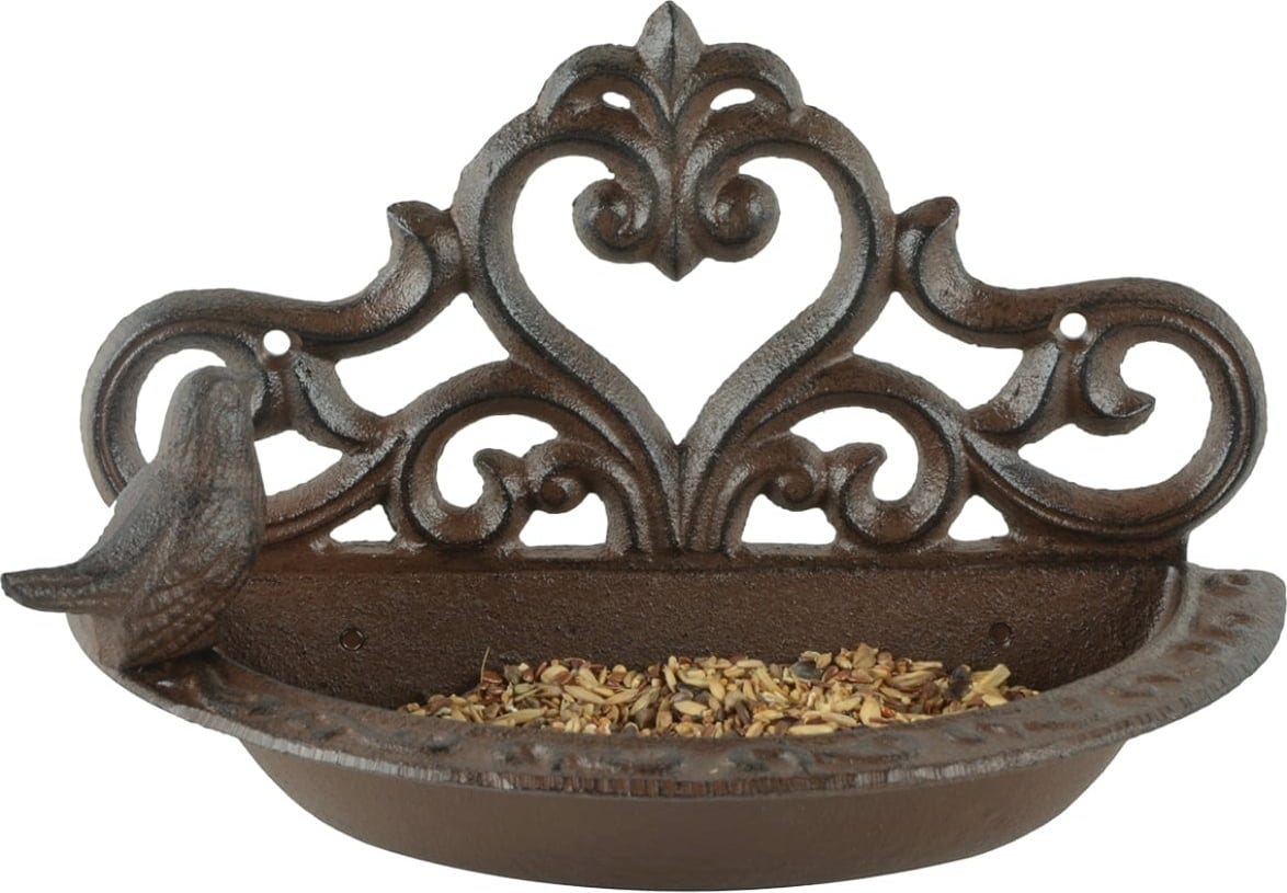 Zwitschernden Gartenbesucher können am Rand dieser kunstvoll geformten Futterschale Platz nehmen und nahrhaftes Körnerfutter herauspicken. So kannst du Vögel in der kalten Jahreszeit und auch darüber hinaus mit Futter versorgen und dich an ihrem Anblick erfreuen.