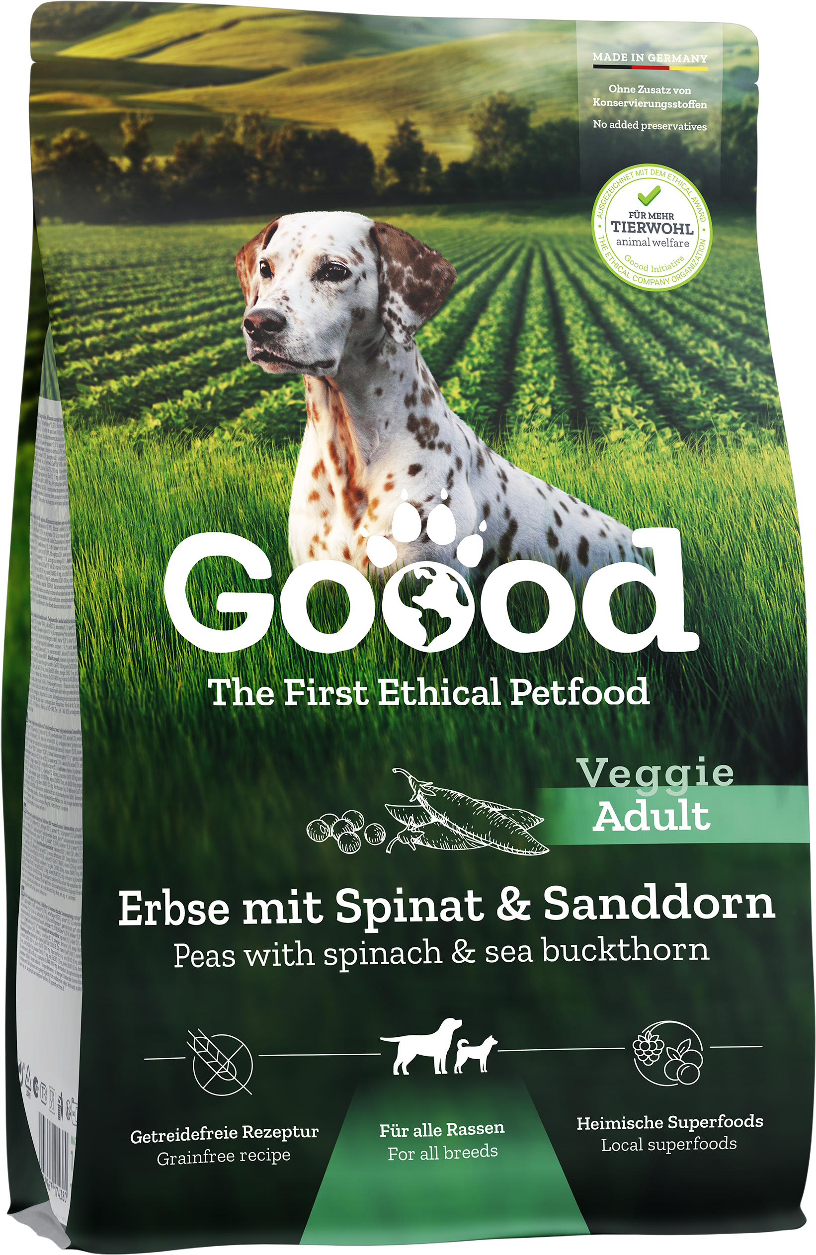 Stell dir vor: Dein Liebling genießt eine ebenso schmackhafte wie artgerechte Mahlzeit ganz ohne Fleisch, dafür mit Erbsen, Spinat, Sanddorn sowie Beeren und Kräutern aus regionalem Anbau. Das ist geballte Naturkraft, die deinen Hund artgerecht und schmackhaft mit allen wichtigen Nährstoffen versorgt. Ein echtes Wohlfühl-Menü, das ethisch korrekt und verdammt lecker ist!
