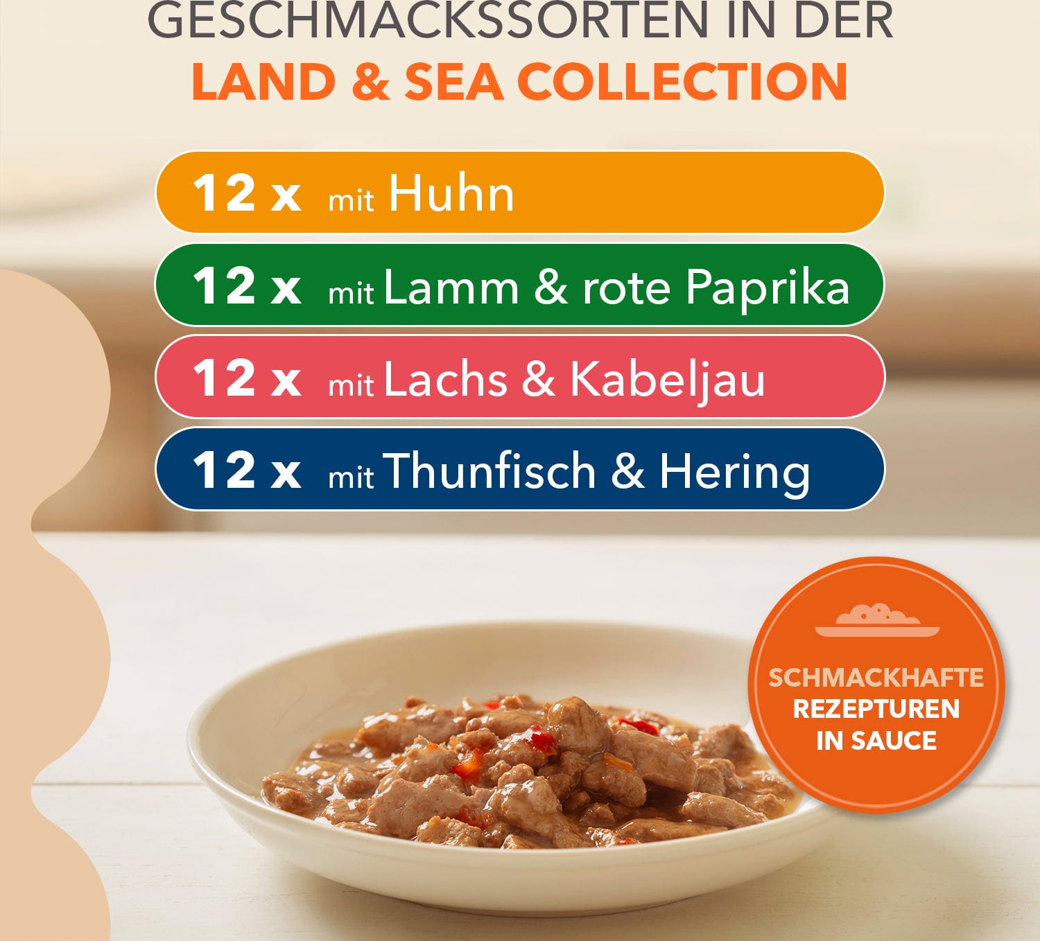 - Mit vier köstlichen Sorten: Huhn, Lamm & rote Paprika, Wilder Thunfisch & Hering, Lachs & Kabeljau