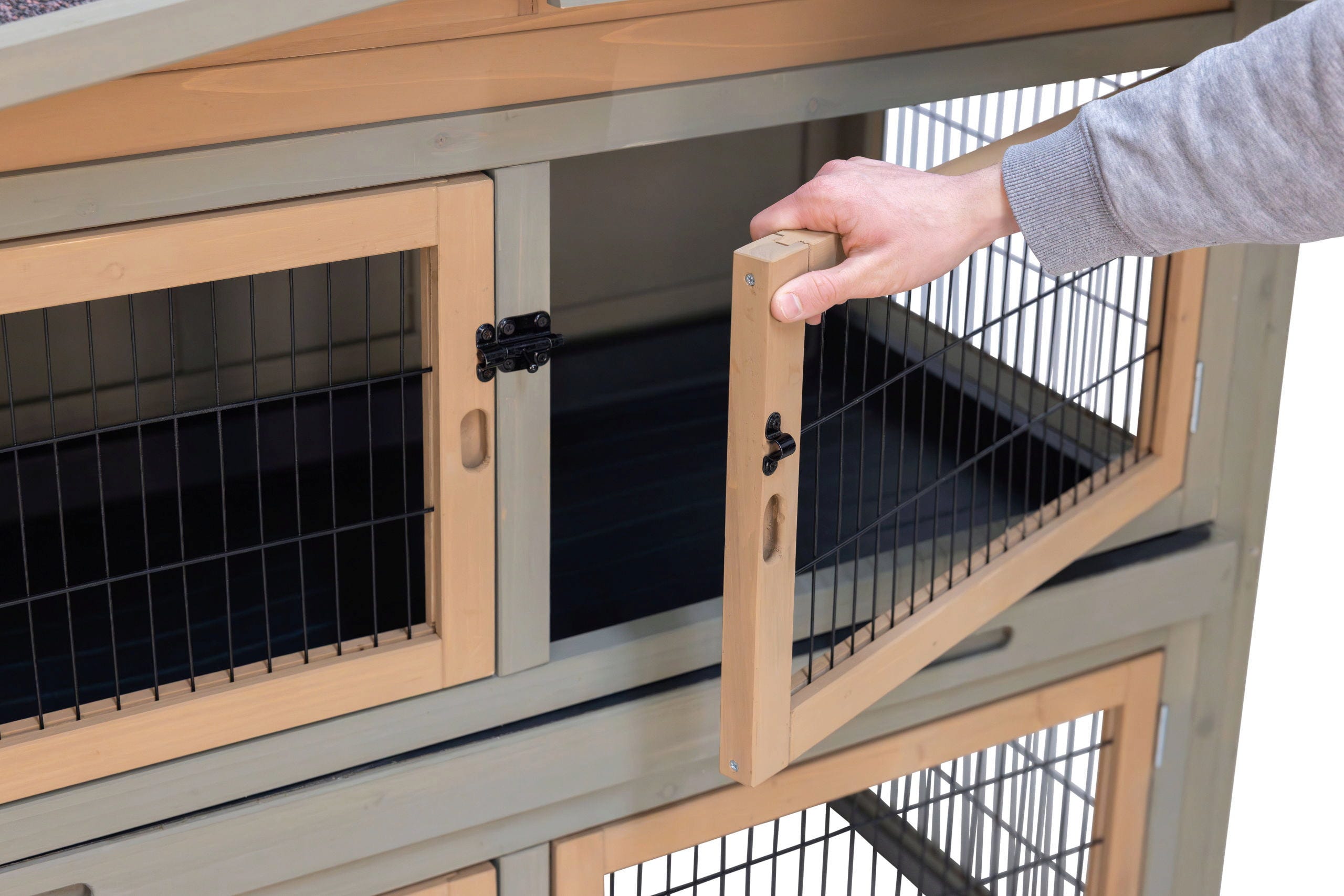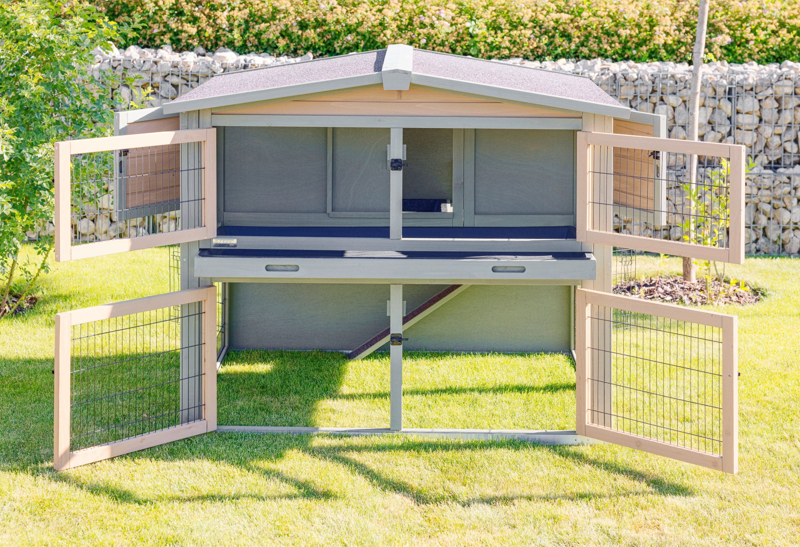 - Erweiterbarkeit: An den unteren Seitentüren können problemlos weitere Freilaufgehege angedockt werden.