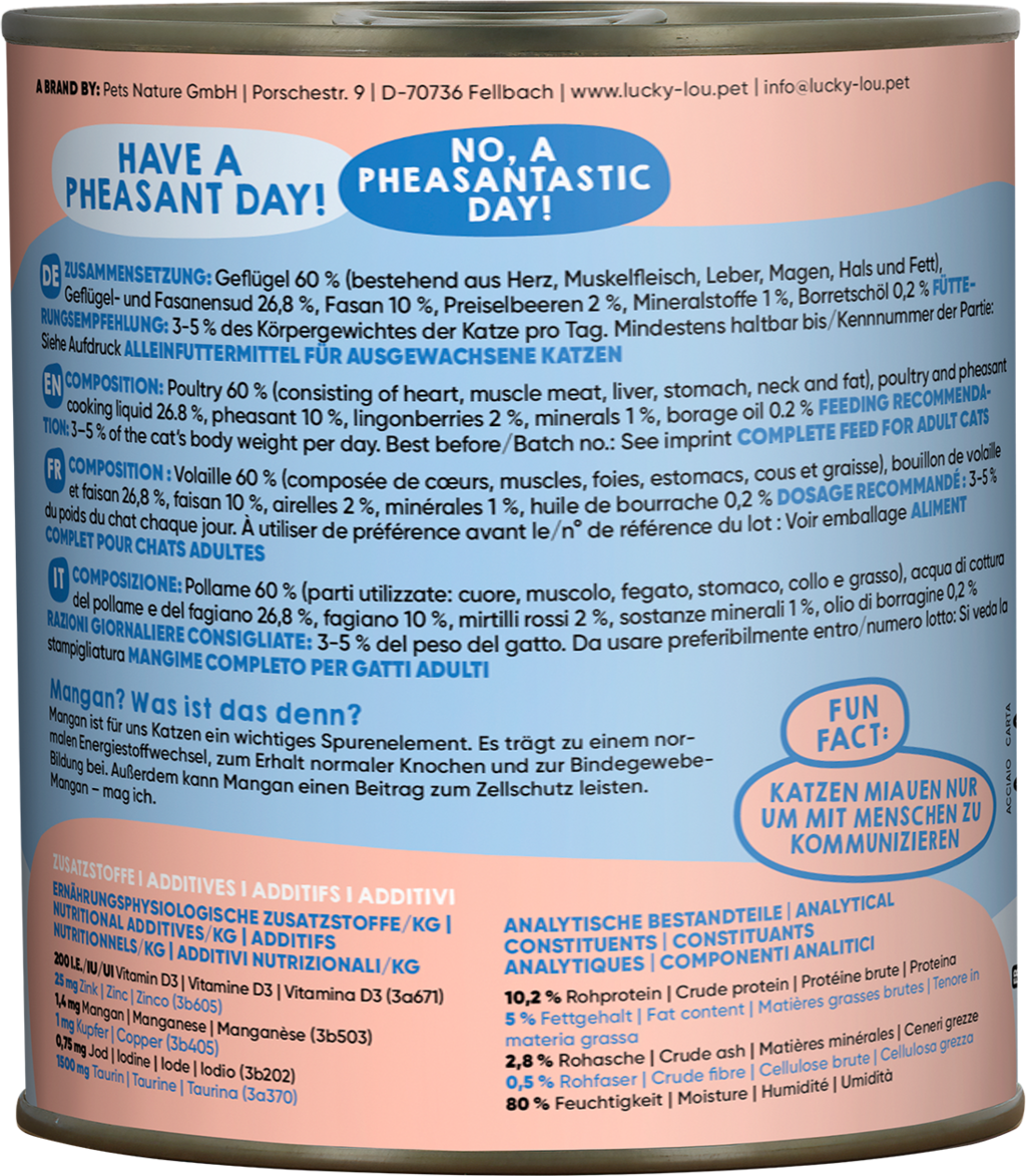 60 % Geflügel (Herz, Muskelfleisch, Leber, Magen, Hals, Fett), 26,8 % Geflügel- und Fasanensud, 10 % Fasan, 2 % Preiselbeeren, 1 % Mineralstoffe, 0,2 % Borretschöl
