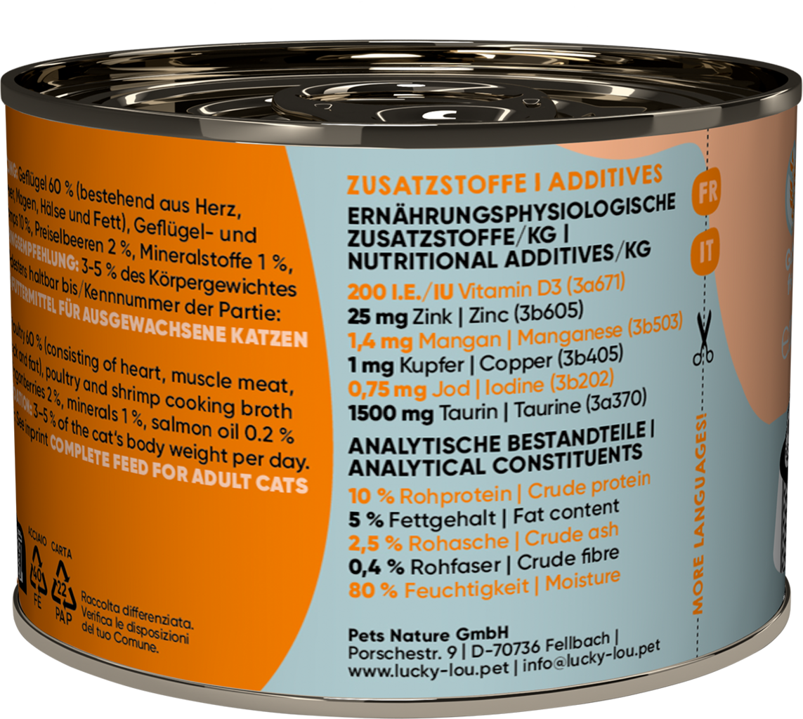 60 % Geflügel (Herz, Muskelfleisch, Leber, Magen, Hals, Fett), 26,8 % Geflügel- und Shrimpsud, 10 % Shrimps, 2 % Preiselbeeren, 1 % Mineralstoffe, 0,2 % Lachsöl