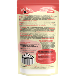 70 % Geflügel (Herz, Muskelfleisch, Leber, Magen, Hals, Fett), 26,8 % Geflügelsud, 2 % Karotten, 1 % Mineralstoffe, 0,2 % Nachtkerzenöl