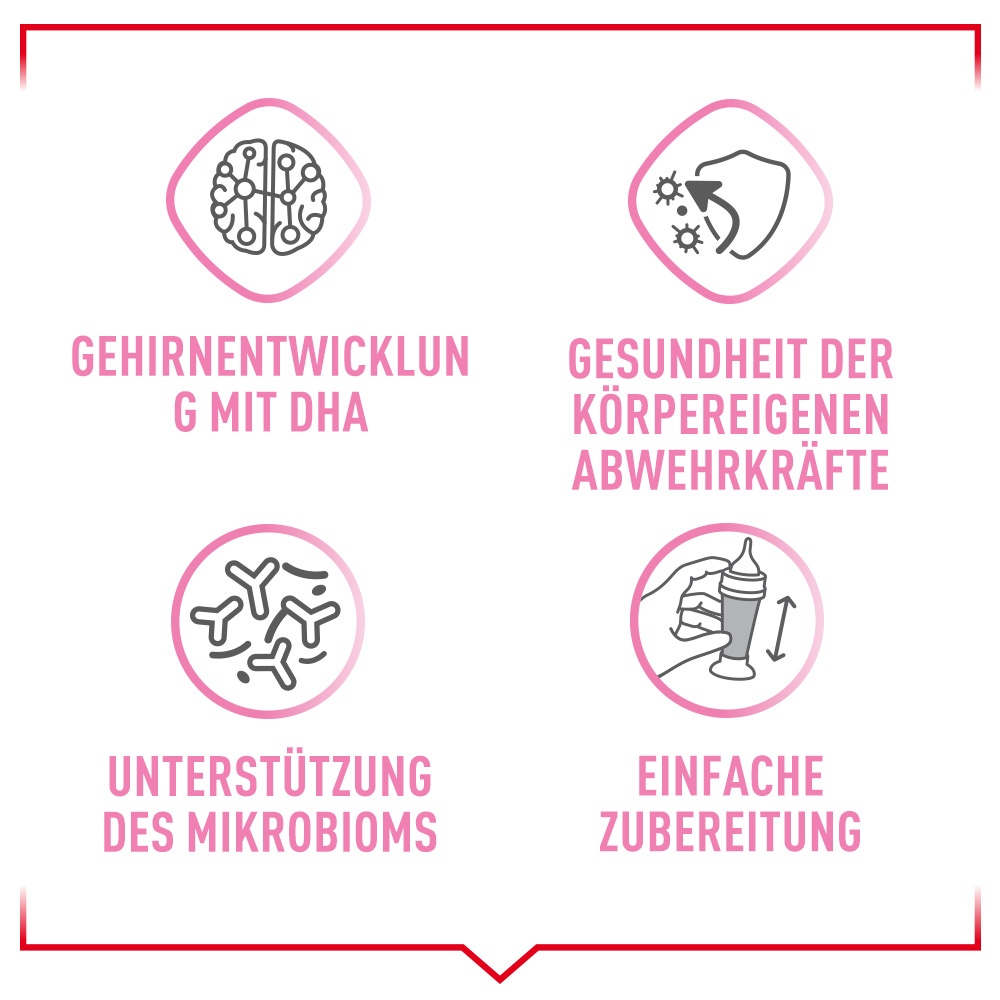 Milchretentat, Milchfett, raffiniertes Palmöl (aus nachhaltigen Quellen), Molkeneiweiß, raffiniertes Sojaöl, raffiniertes Kopra-Öl, Mineralstoffe, 0,51 % Fructo-Oligosaccharide, Fischöl (Quelle für DHA), Pilzöl