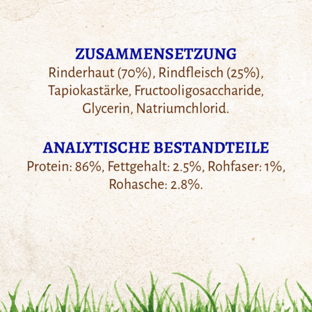 70 % Peau de bœuf, 25 % Viande de boeuf, Tapioca, Fructooligosaccharides, glycérine, Chlorure de sodium