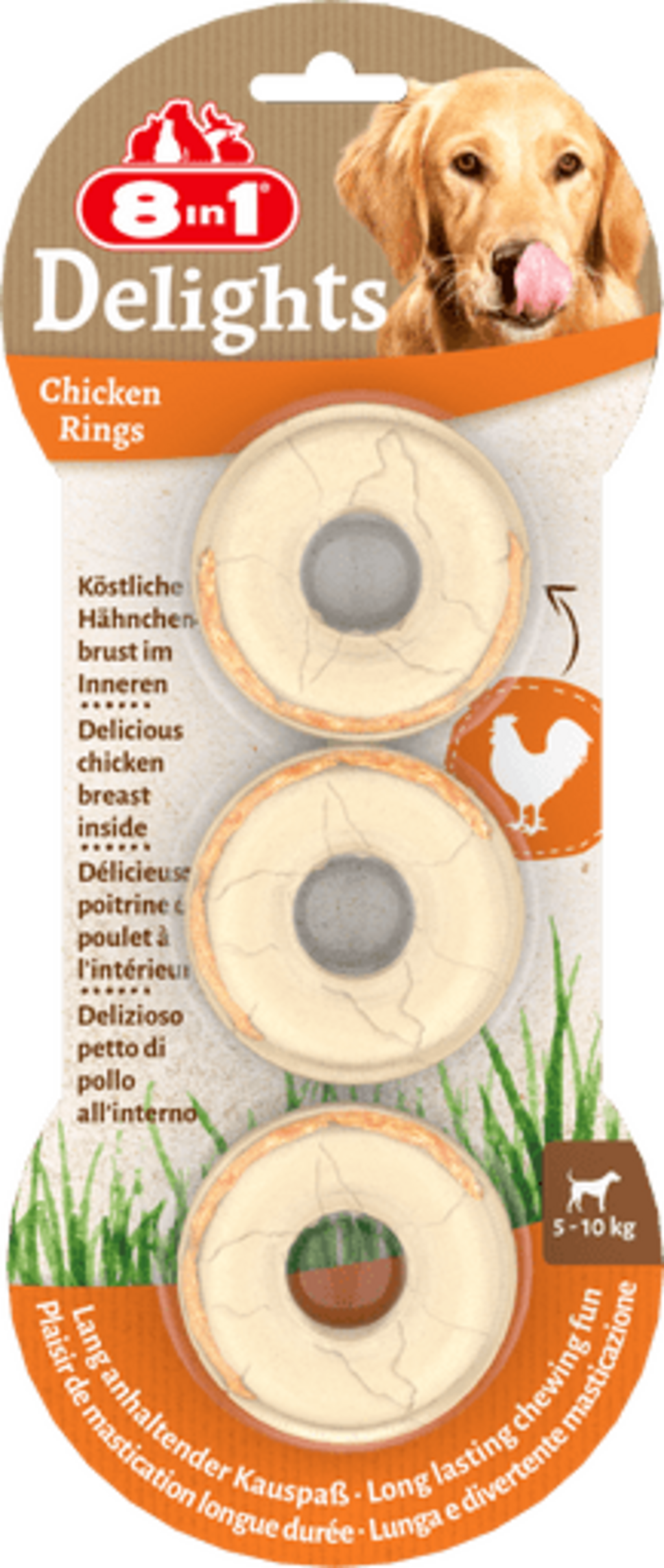 De savoureux blancs de poulet enrobés d'une délicieuse peau de bœuf... Miam ! Les chiens gourmands en ont déjà l'eau à la bouche ! Les Chicken Rings Delights de 8in1 sont excellents à mâcher entre les repas, pour un bon complément à la nourriture classique ! Ils occuperont votre chien pendant des heures, et sont également bénéfiques pour son hygiène dentaire ! La mastication élimine tartre existant.