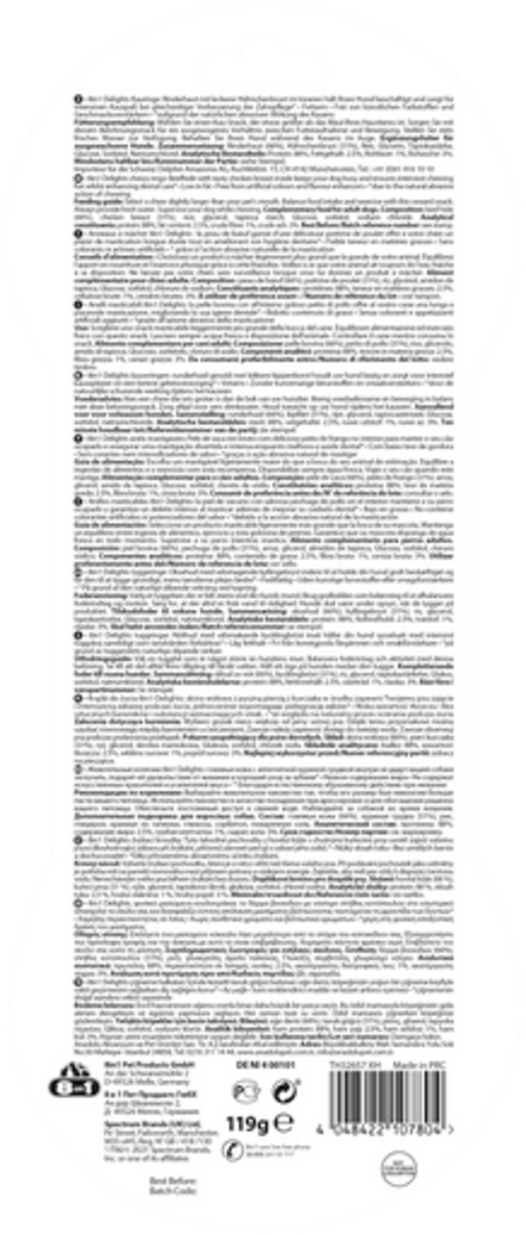 Cette friandise à mâcher cuit au four a une faible teneur en matières grasses et contient beaucoup de protéines. Il ne contient aucun colorant artificiel, exhausteur de goût, OGM ni gluten.