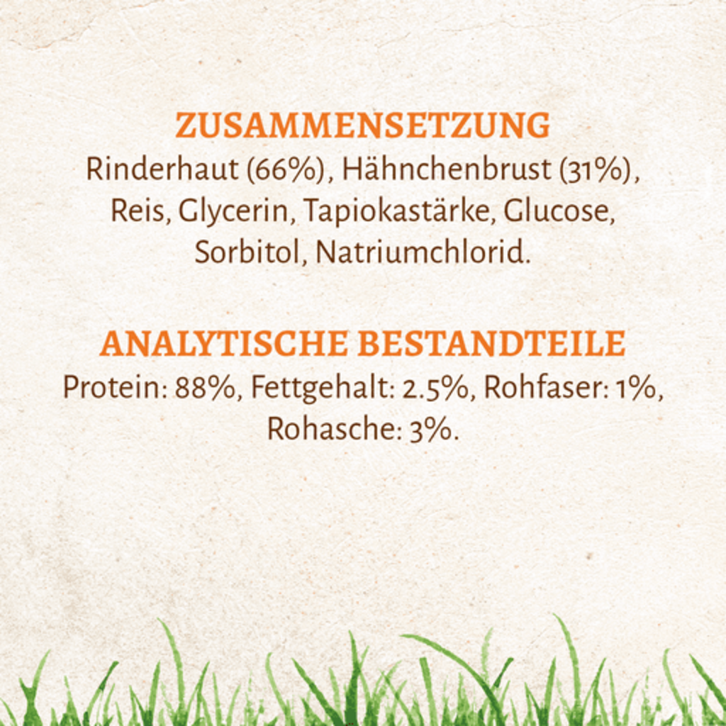 66 % Peau de bœuf, 31 % Blanc de poulet, Riz, glycérine, Tapioca, glucose, Sorbitol, Chlorure de sodium