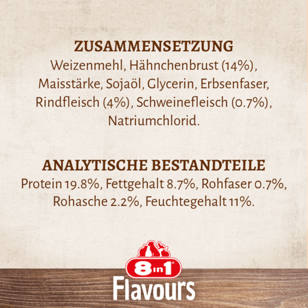 Du porc croustillant enrobé de bœuf et d'une délicieuse poitrine de poulet... Le paradis ? Non, les Flavours Meaty Biscuits de 8in1 ! Ces savoureuses friandises sous forme de biscuits croustillants sont cuites au four, riches en protéines et exempts d'exhausteurs de goût, de conservateurs artificiels ou d'organismes génétiquement modifiés (OGM).