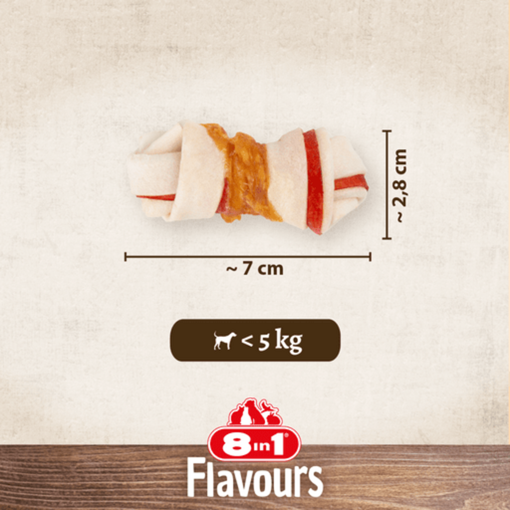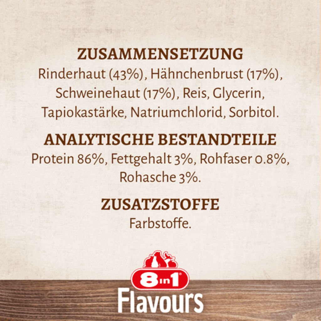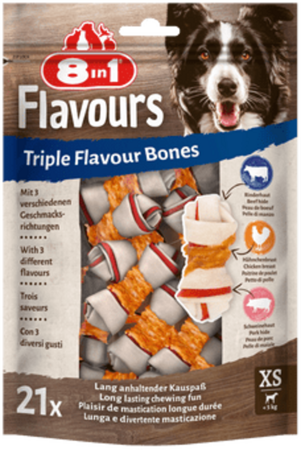 Les os Triple Flavour de 8in1 riches en nutriments sont de délicieuses friandises pour une véritable explosion de saveurs ! Ils associent trois goûts particulièrement savoureux : de la peau de porc et de bœuf, le tout enrobé d'une tendre et juteuse poitrine de poulet.