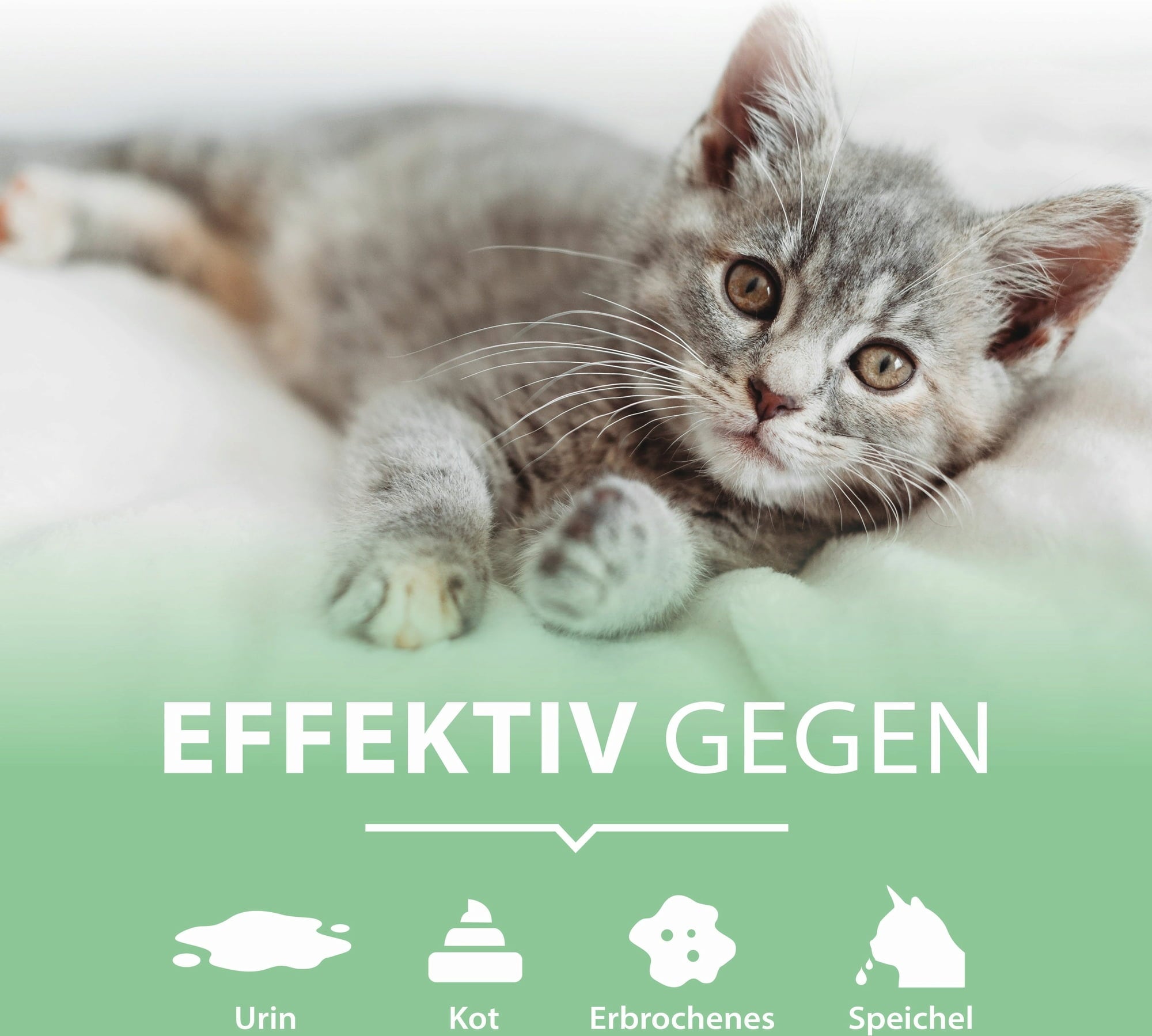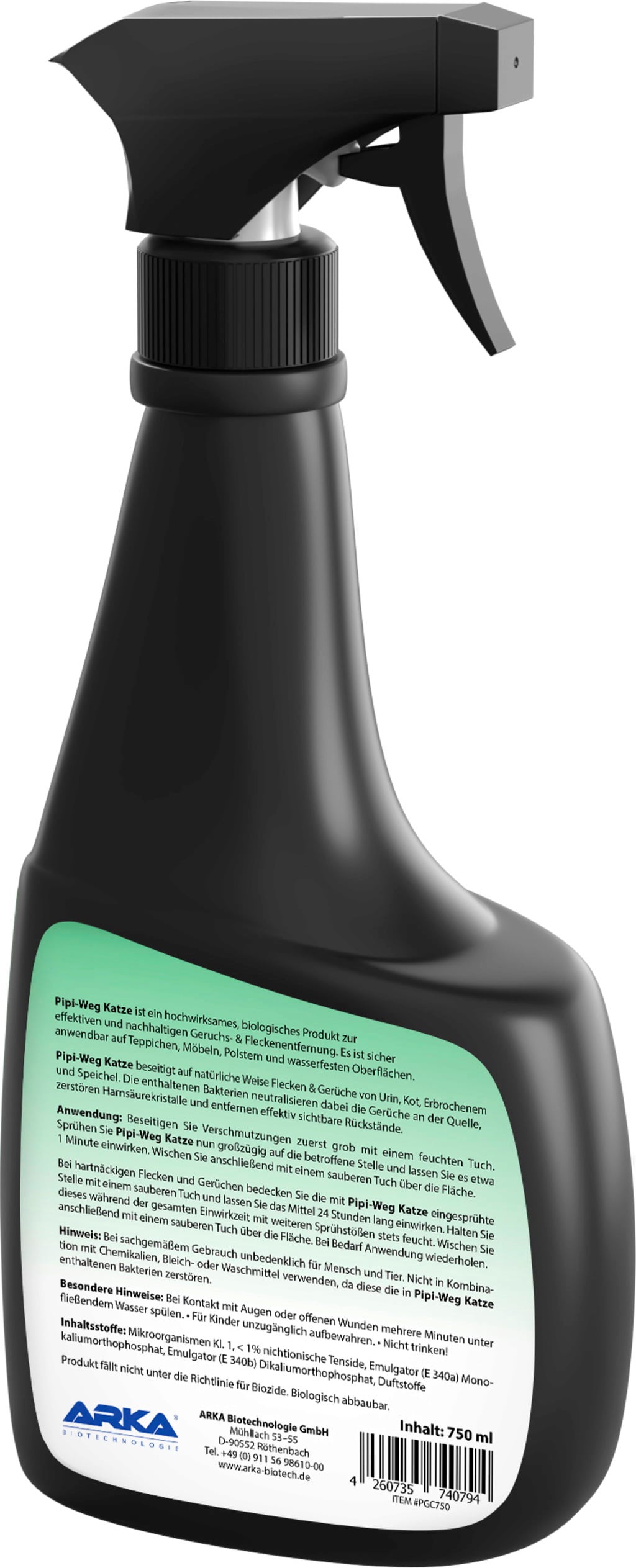 Utilisation : Enlevez d'abord les saletés grossières (excréments, boules de poils, vomi, etc.) avec un chiffon humide. Vaporisez ensuite généreusement Pipi-Weg sur la zone et laissez agir au moins 1 minute. Essuyez ensuite la surface avec un chiffon propre . Pour les taches vraiment tenaces (par exemple, les taches déjà sèches), il faut laisser agir pendant 24 heures. Attention : Pendant toute la durée d'exposition, la zone doit toujours être maintenue humide par pulvérisation permanente ! Pour finir, essuyez avec un chiffon propre.