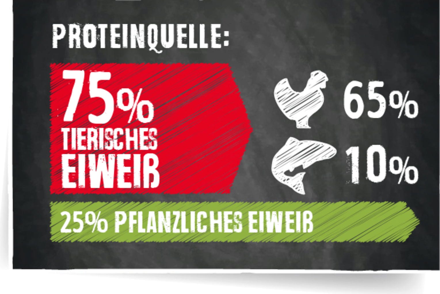 30 % viande de volaille fraîche, maïs, 16 % protéines de volaille faibles en cendres et séchées, riz, 14 % fécule de pomme de terre, 3 % farine de poisson de mer, pulpe de betterave séchée désucrée, farine de caroube séchée, 2,5 % tourteau de pépins de raisin, levure de bière inactivée et séchée, phosphate dicalcique, graines de chia, foie de volaille hydrolysé, graisse de volaille, huiles végétales, chlorure de sodium, Kaliumchlorid, herbes séchées, Yucca schidigera