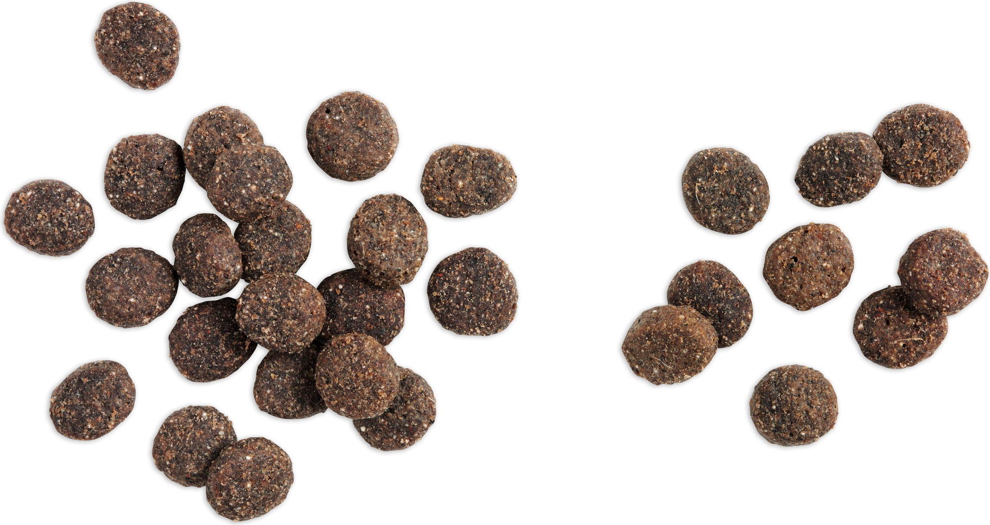 27 % protéines de volaille séchées, fécule de pomme de terre, farine de pois, graisse de volaille, farine de haricots[1], pulpe de betterave séchée désucrée, farine de poisson de mer, 2,5 % levure de bière inactivée et séchée, farine de caroube séchée, 1,5 % huile de saumon, foie de volaille hydrolysé, fibre de pois, 1,1 % graines de lin, chlorure de sodium, Kaliumchlorid, 0,2 % herbes séchées[2], 25 % Yucca schidigera