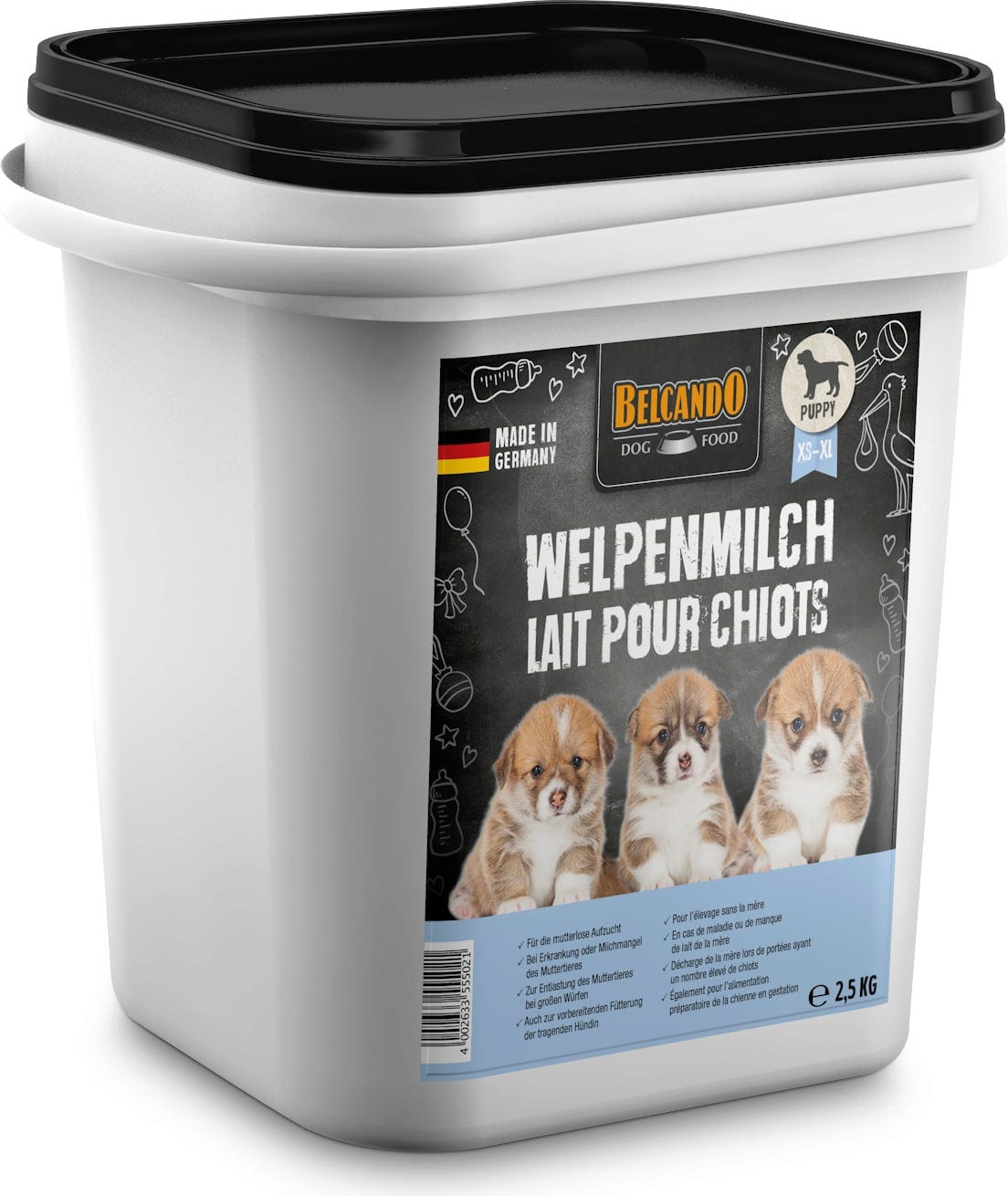 Puppy Milk de Belcando® est un lait en poudre hautement soluble, spécialement conçu pour répondre aux besoins des chiots. Ce substitut de lait convient aux chiots élevés sans leur mère ainsi qu’à ceux dont la mère ne produit pas suffisamment de lait (par exemple en cas de maladie). À l’instar du lait maternel, il contient des vitamines A, E et D3. Sans colorants ni arômes artificiels !