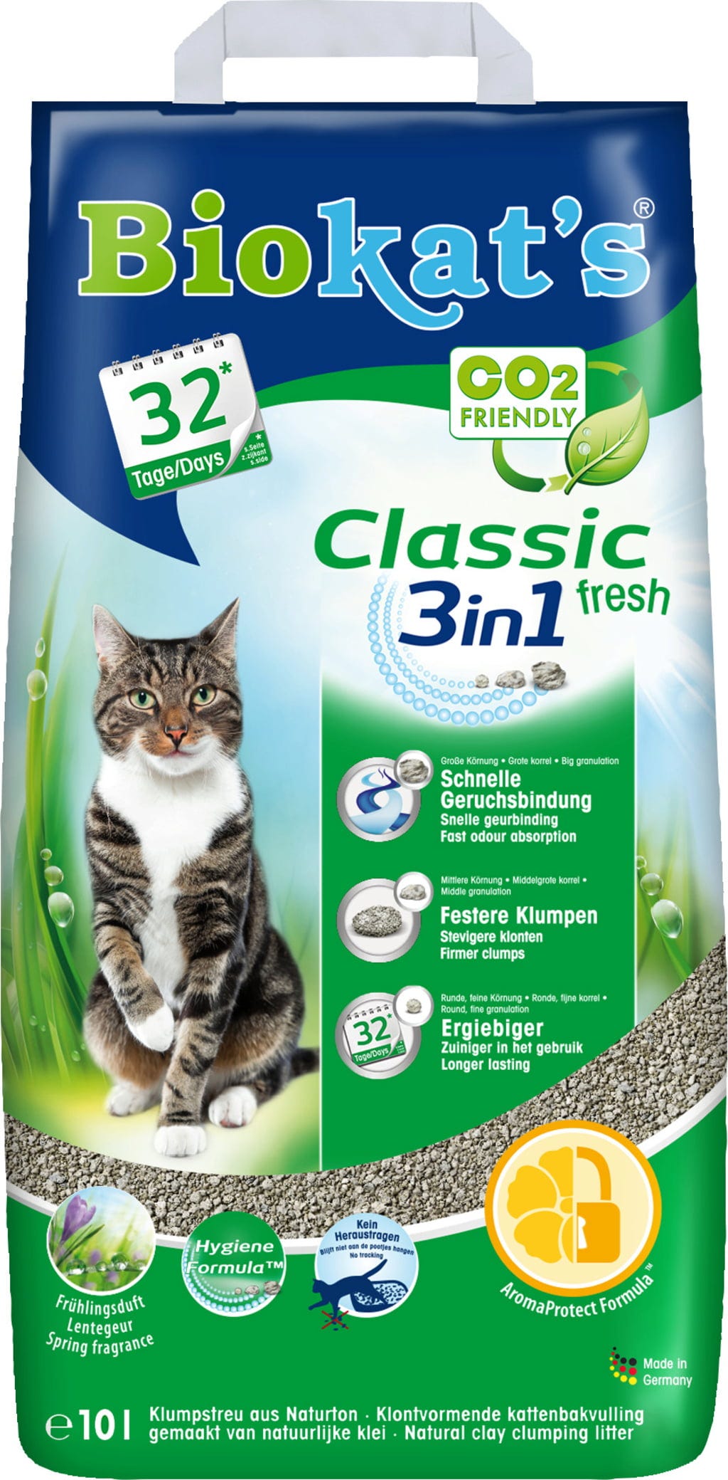 Un classique de la gamme Biokat's : Classic 3in1 est composé à 100 % d’argile naturelle en trois granulométries différentes, selon la Hygiene Formula™. Cette combinaison permet à la fois la formation d’agglomérats particulièrement compacts, faciles à retirer et une neutralisation rapide des odeurs. Par ailleurs, la litière n’adhère ni au pelage ni aux pattes, et reste ainsi dans le bac.