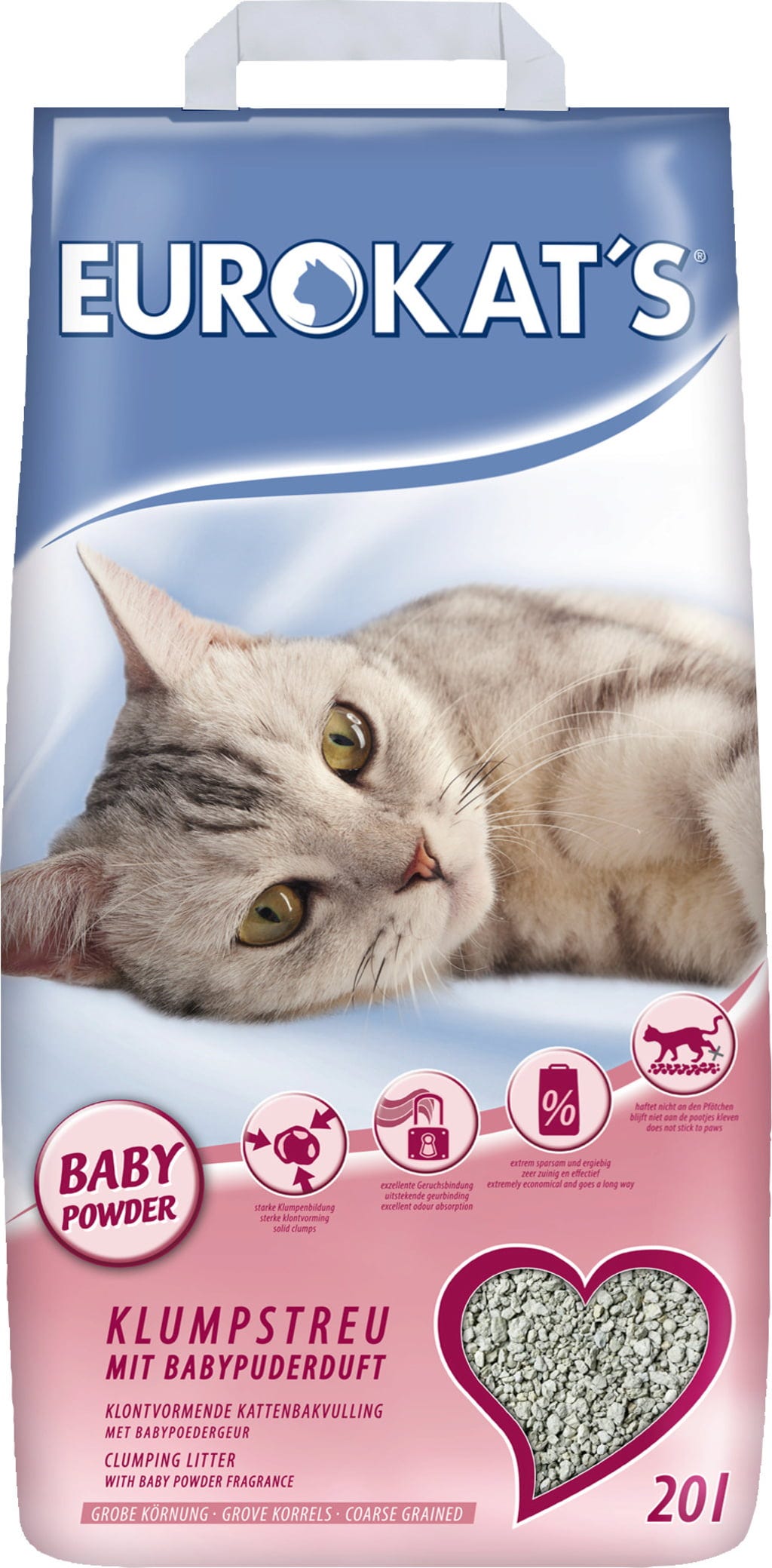 Un classique parfumé : la litière agglomérante Eurokat's au parfum de talc pour bébé fait partie des références traditionnelles. En plus d’une excellente neutralisation des odeurs, elle offre une formation d’agglomérats solides et compacts, permettant de retirer plus facilement les résidus. Ce comportement améliore également l’hygiène. De plus, la litière n’adhère ni au pelage ni aux pattes – idéale pour une utilisation dans les espaces de vie.