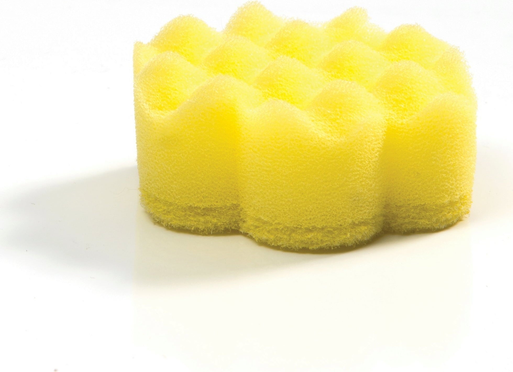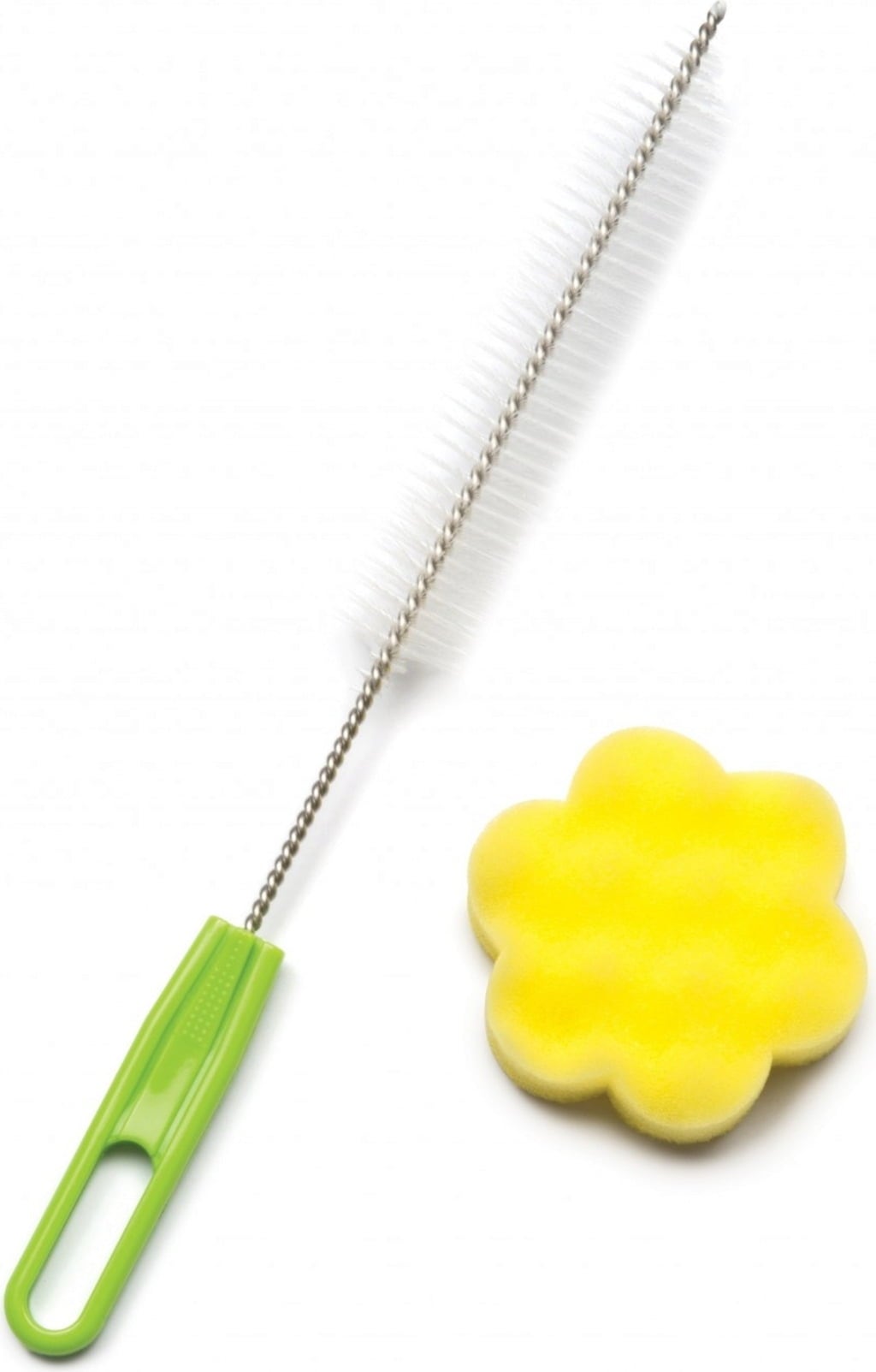 La brosse à poils durs se fraie un chemin partout grâce à sa tige allongée et nettoie les grosses saletés comme les miettes ou les poils de chat, tandis que l'éponge en forme de fleur à deux textures élimine les saletés légères et plus tenaces des surfaces en plastique.