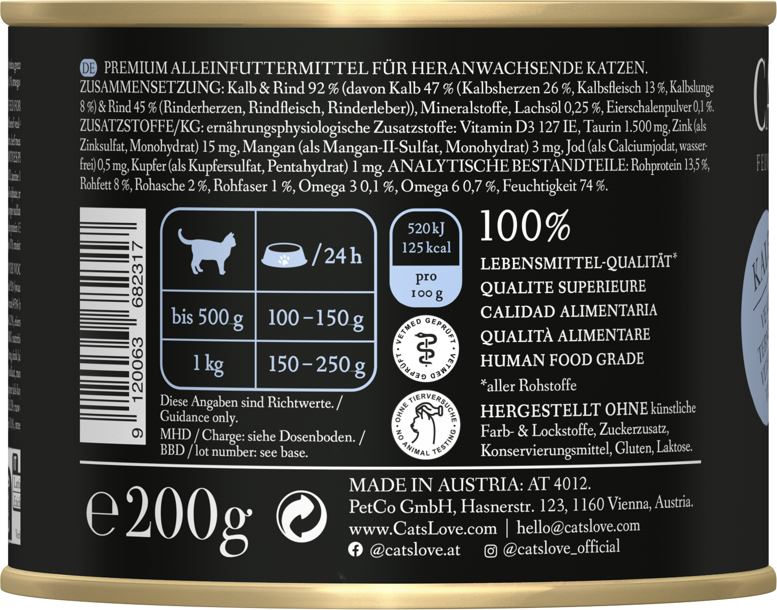 Avec une teneur en viande de 92 % issue de tendre viande de veau, ce produit garantit une qualité optimale et une saveur que votre chaton appréciera particulièrement. Ce délicieux aliment humide à base de veau ne contient ni conservateurs ni attractifs artificiels.