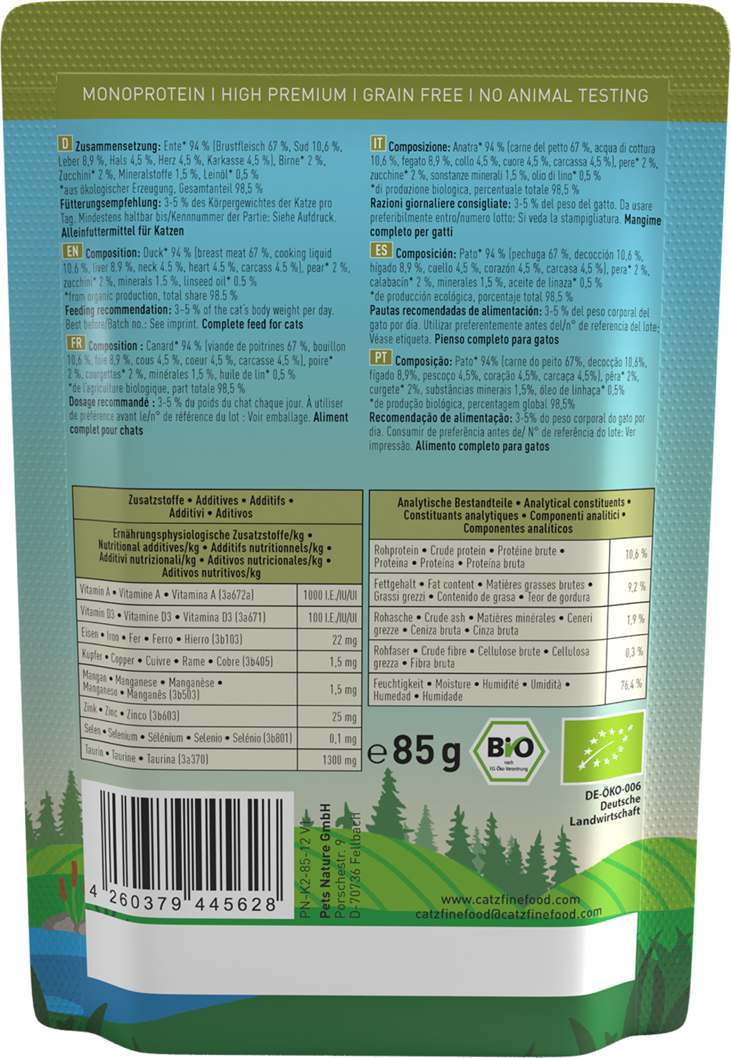 Cette alimentation humide monoprotéique de haute qualité et de qualité biologique offre à votre félin un plaisir proche de la nature et adapté à son espèce. Des ingrédients biologiques sélectionnés et une recette spéciale selon le concept de la proie fournissent à votre chat tout ce dont il a besoin et contribuent ainsi de manière fondamentale à une vie féline pleine de vitalité.