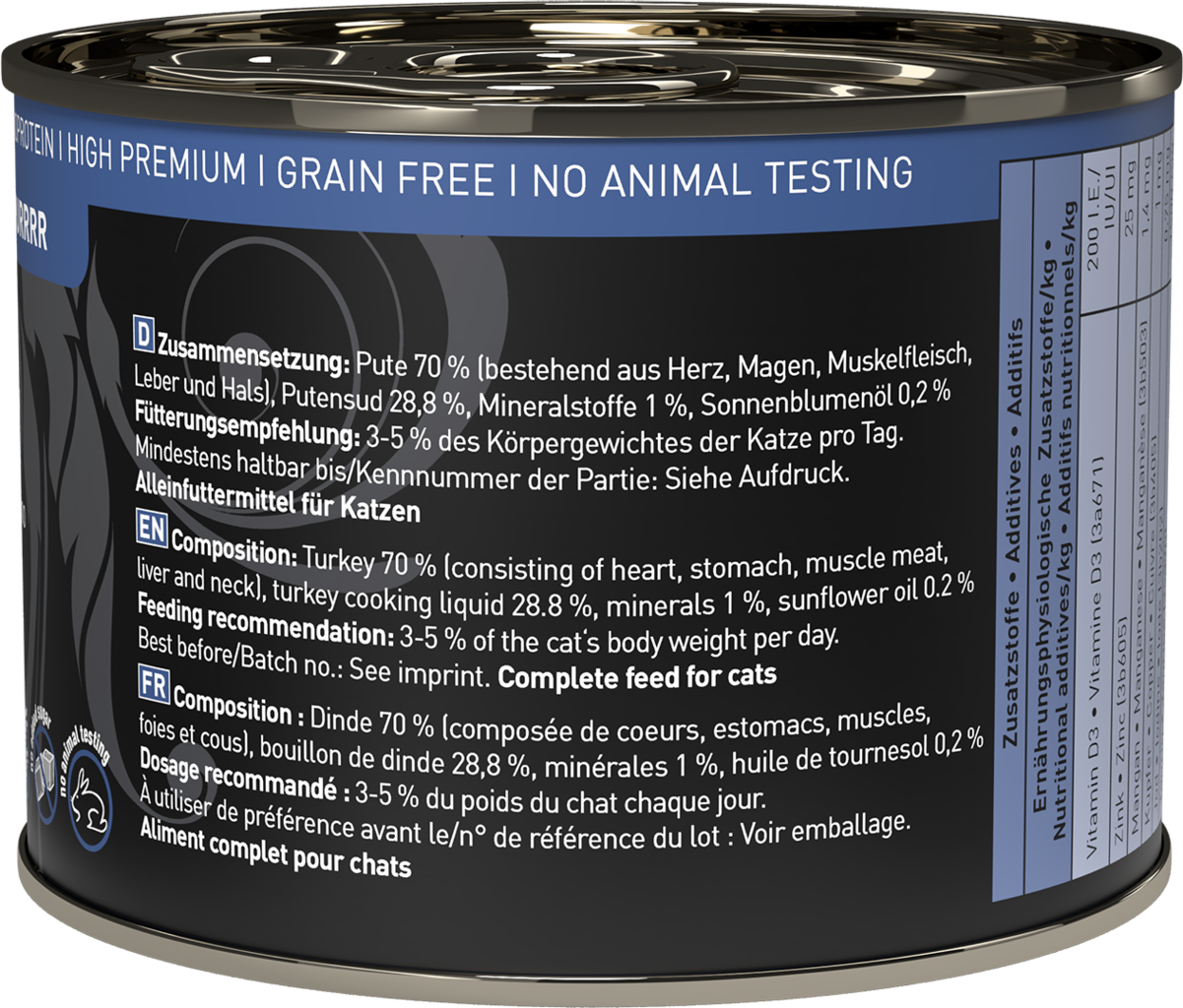 70 % dinde (cœur, estomac, muscle, foie, cou), 28,8 % Putensud, 1 % Mineralstoffe, 0,2 % huile de tournesol