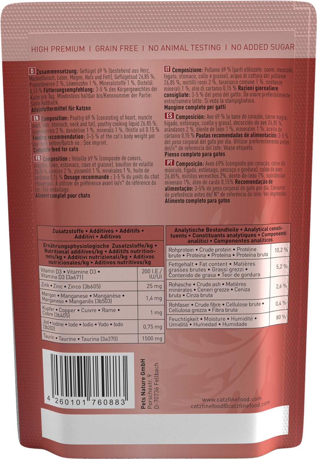 69 % volaille (muscle, cœur, estomac, foie, cou), 26,85 % bouillon de poulet, 2 % canneberges, 1 % feuilles de pissenlit, 1 % Mineralstoffe, 0,15 % huile de carthame