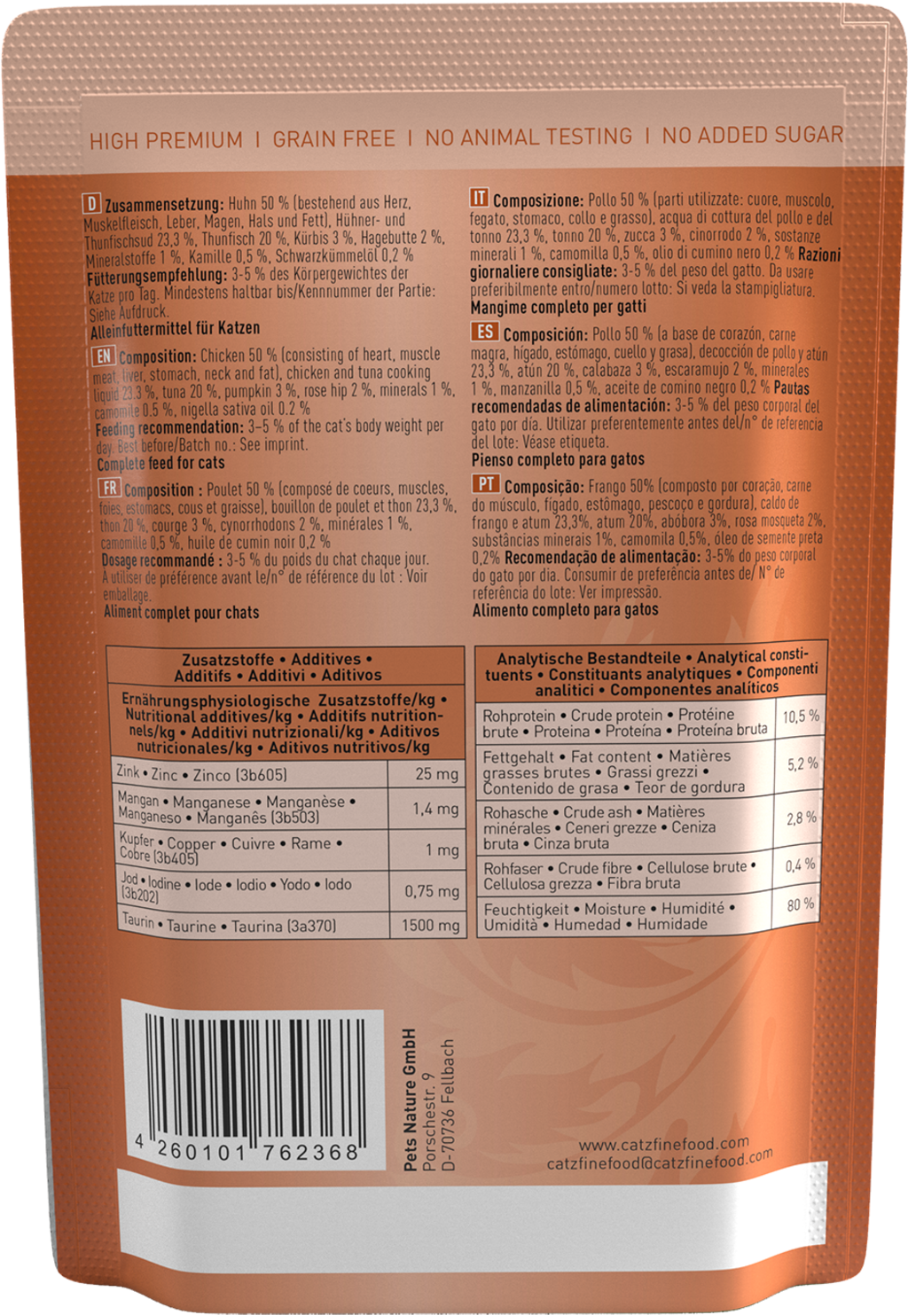 50 % poulet (cœur, muscle, foie, estomac, cou, graisse), bouillon de poulet, 23,3 % bouillon de thon, 20 % thon, 3 % courge, 2 % cynorrhodons, 1 % Mineralstoffe, 0,5 % camomille, 0,2 % huile de graines de cumin noir