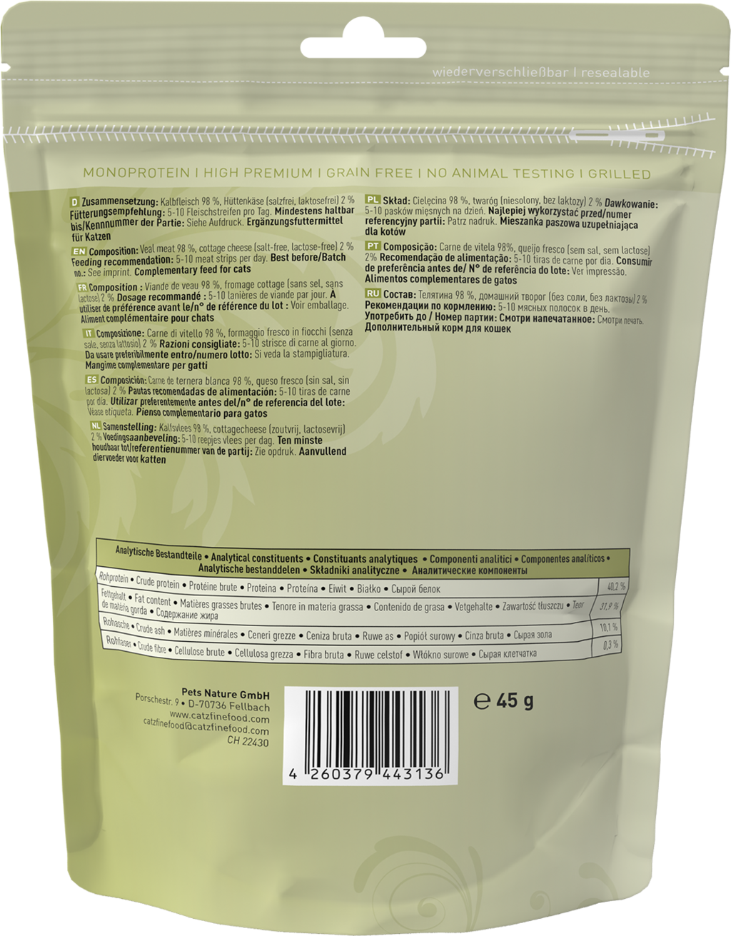 | Caractéristique du produit: | Sans colorants, Sans OGM, Sans exhausteurs de goût, Sans conservateurs, Sans colorants artificiels, Sans colorants ni arômes artificiels, Sans arômes artificiels, Sans sucres ajoutés, Sans céréales, Sans gluten, Mono-protéine, Sans tests sur les animaux |