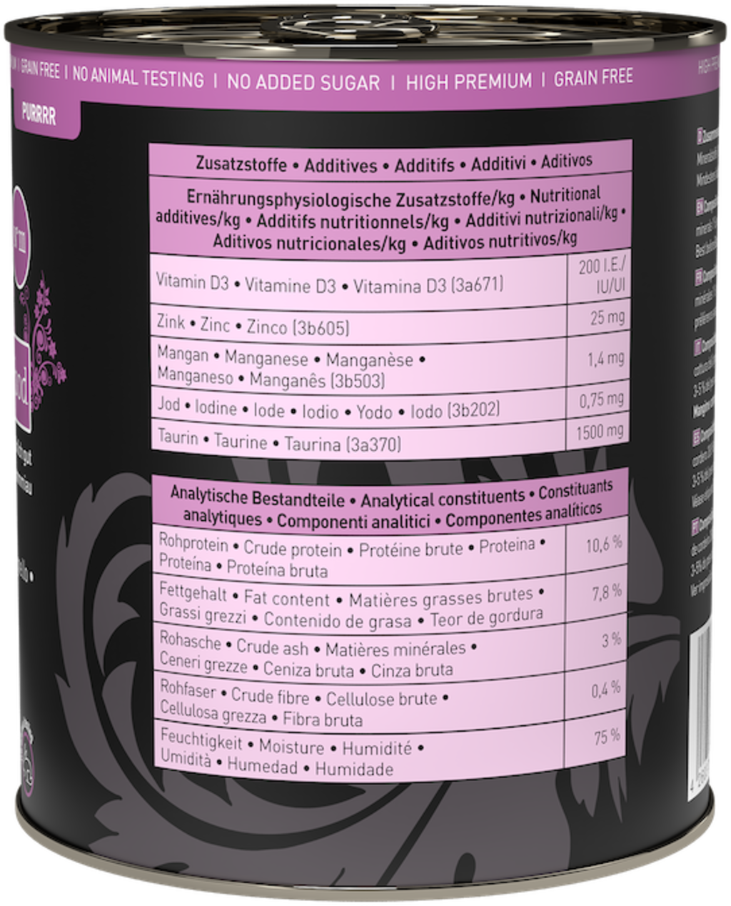 - Sans viande transformée, farine de viande, agents de charge ou substituts de viande, céréales, gluten, sucres ajoutés, attractifs, exhausteurs de goût ou arômes artificiels, colorants et conservateurs