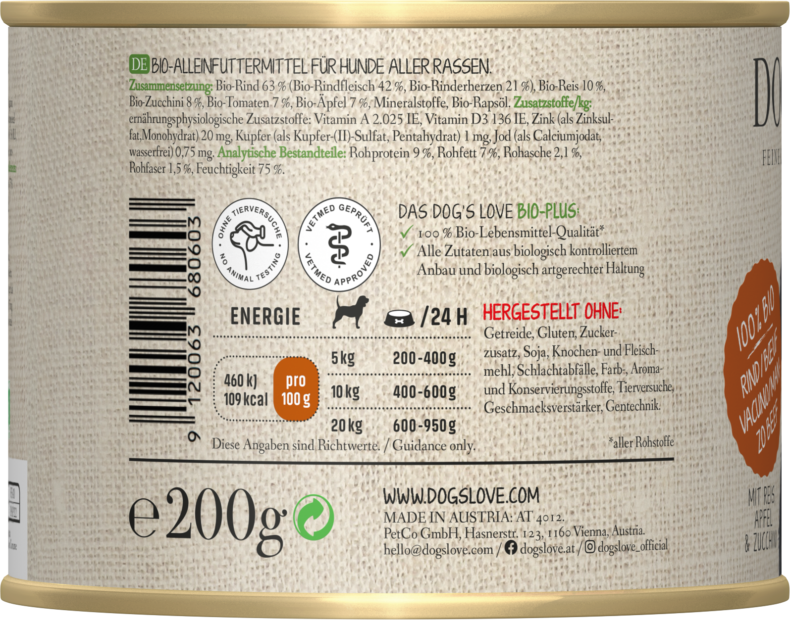 DOG'S LOVE Pâtée pour Chien BIO Bœuf, 200 g