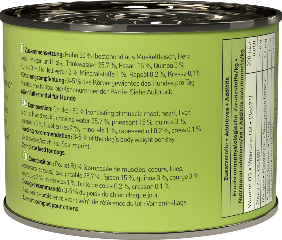 50 % poulet (muscle, cœur, foie, estomac, cou), 25,7 % eau , 15 % faisan, 3 % Quinoa, 3 % courge, 2 % myrtilles, 1 % Mineralstoffe, 0,2 % huile de colza, 0,1 % Kresse