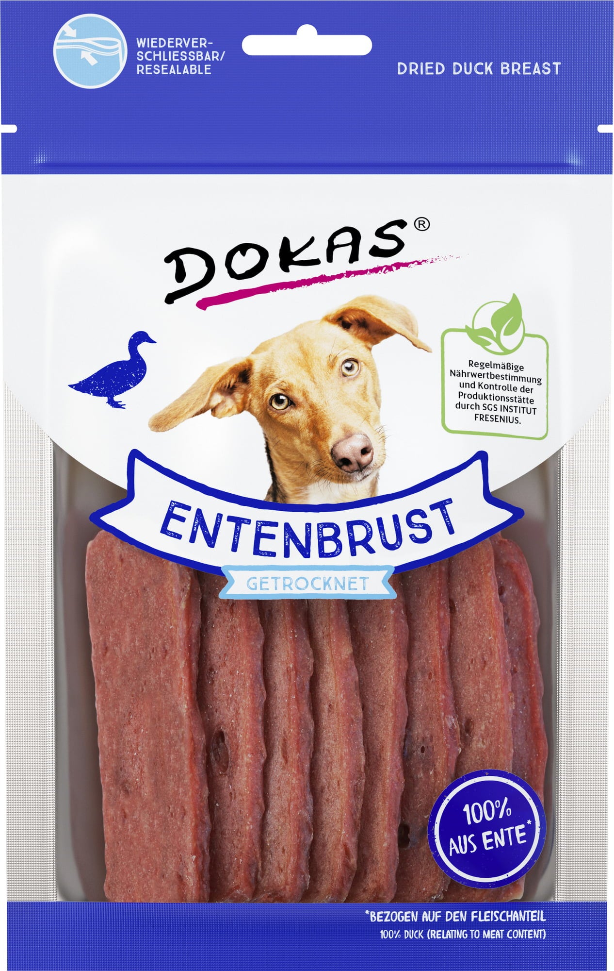 Aucun chien ne peut résister aux lamelles de viande aromatiques et séchéées à l’air de Dokas ! Elles sont fabriquées à partir de 100 % de filet de poitrine de canard* de haute qualité et constituent une délicieuse friandise entre les repas.