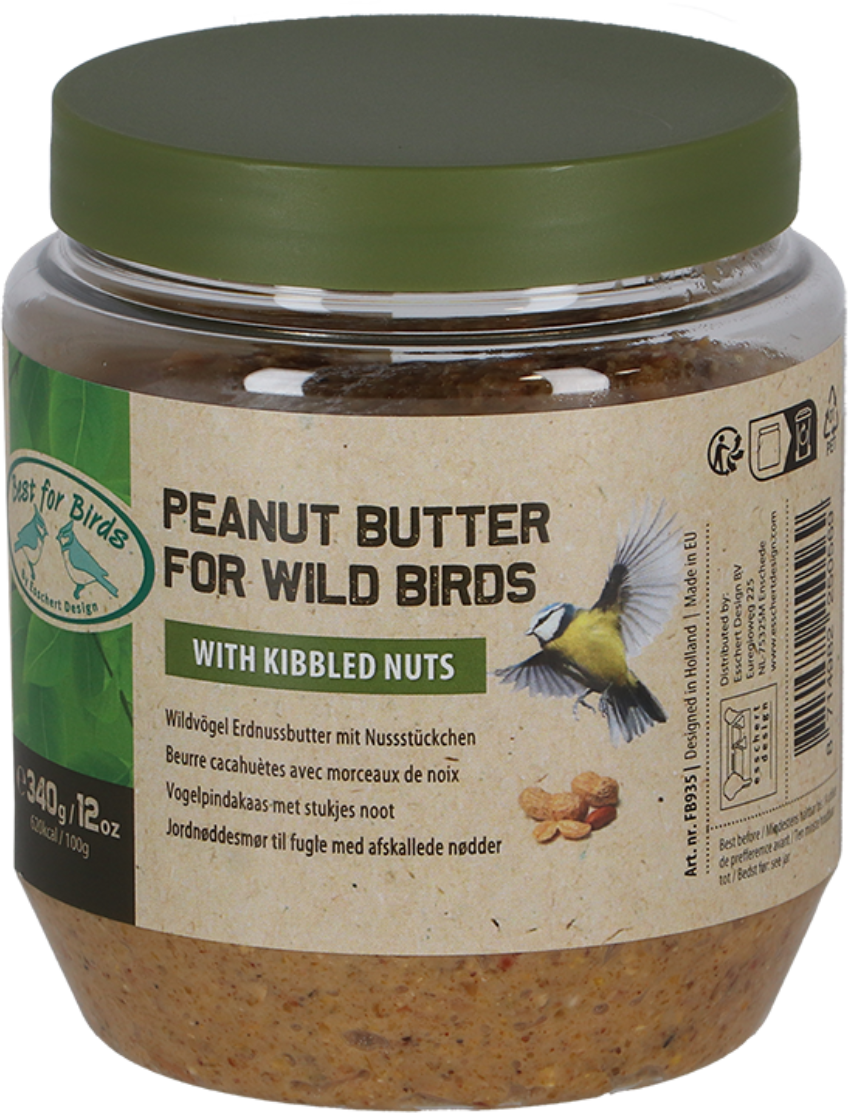 Ce beurre de cacahuète contient des morceaux de noix croquants et fournit aux oiseaux une grande quantité de graisses précieuses. Il peut être distribué toute l'année et constitue une friandise nourrissante pour les nombreuses espèces d'oiseaux dans votre jardin !
