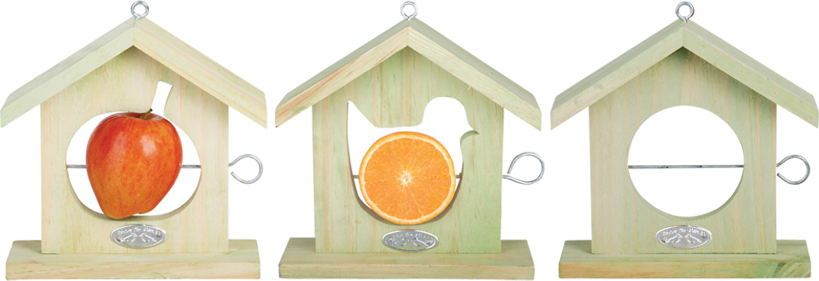 À l'aide de la tige métallique qui peut être retirée sur le côté, la petite maison peut être remplie d'aliments pour animaux, tels que des pommes ou d'autres fruits. Ces stations d'alimentation ne doivent pas être placées trop bas, afin d'éviter de possibles prédateur. Brossez avec de l'eau tiède au moins une fois par an pour nettoyer la petite maison.