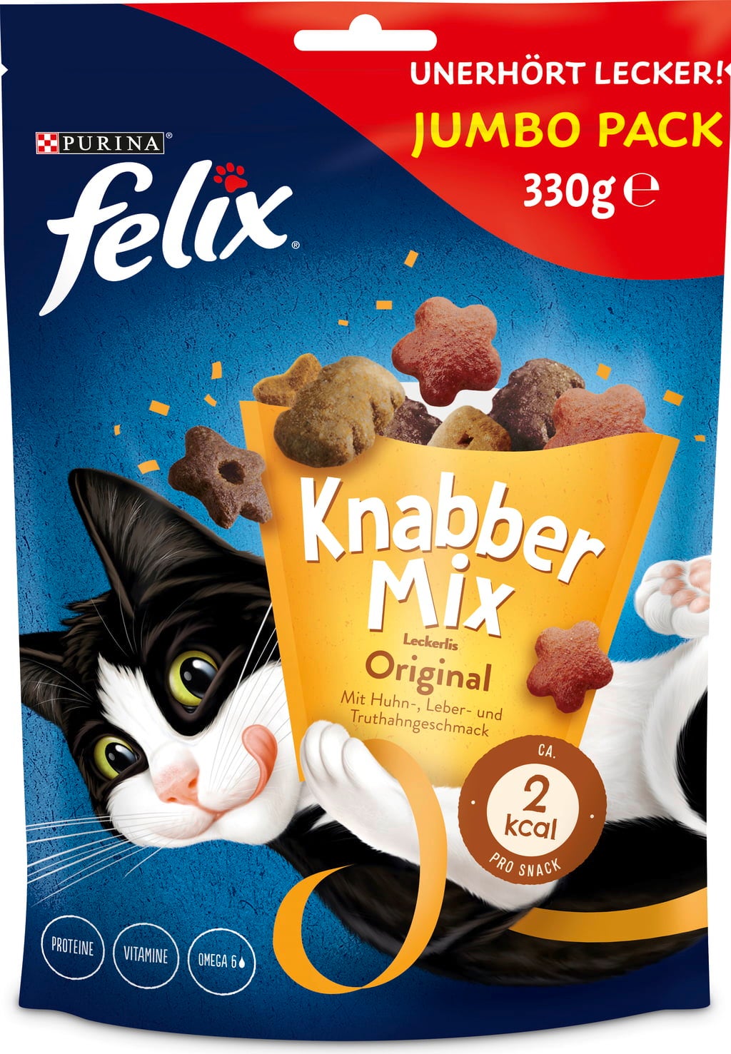 Bon, meilleur, KnabberMix Original de Felix ! Des saveurs irrésistibles de poulet, de dinde et de foie éveillent les papilles et restent gravées dans la mémoire des petits gourmands. Le mélange se présente sous différentes formes délicieusement parfumées, contenant chacune environ 2 kcal. De quoi faire ronronner de plaisir !