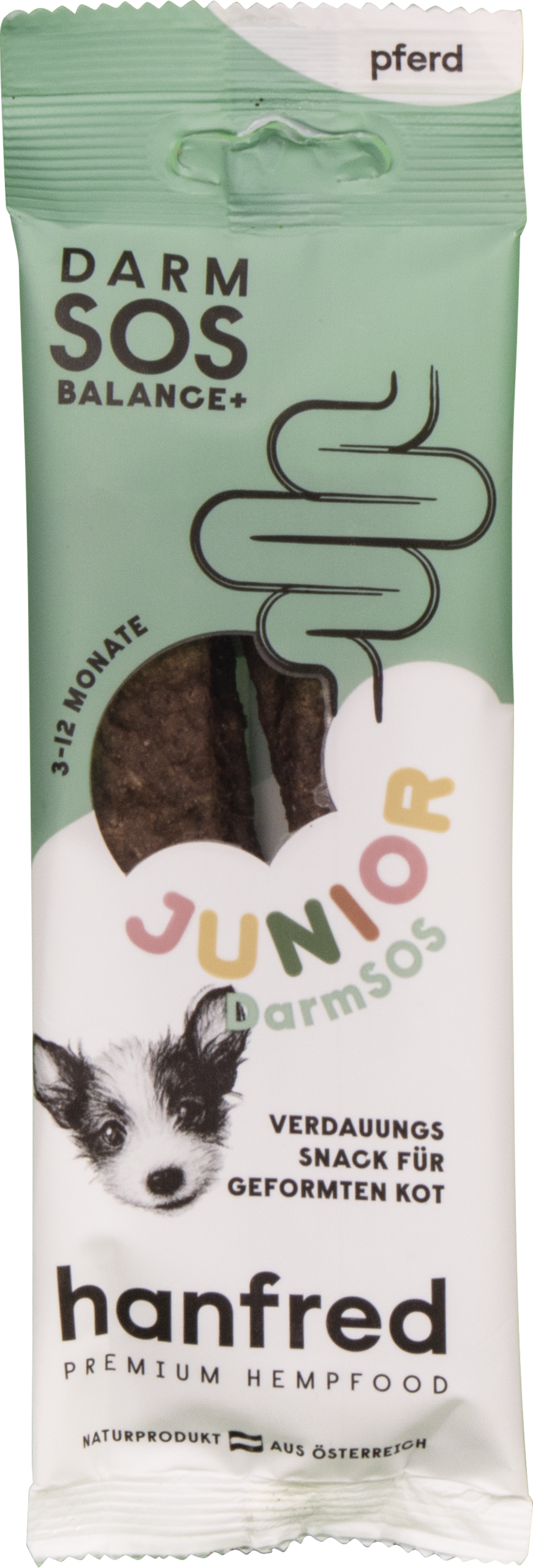 Les sticks Darm SOS, à base de viande de cheval, soutiennent l'équilibre intestinal et constituent un complément alimentaire adapté aux jeunes chiens. Ils contiennent une seule source de protéines animales et peuvent être proposés en collation entre les repas.