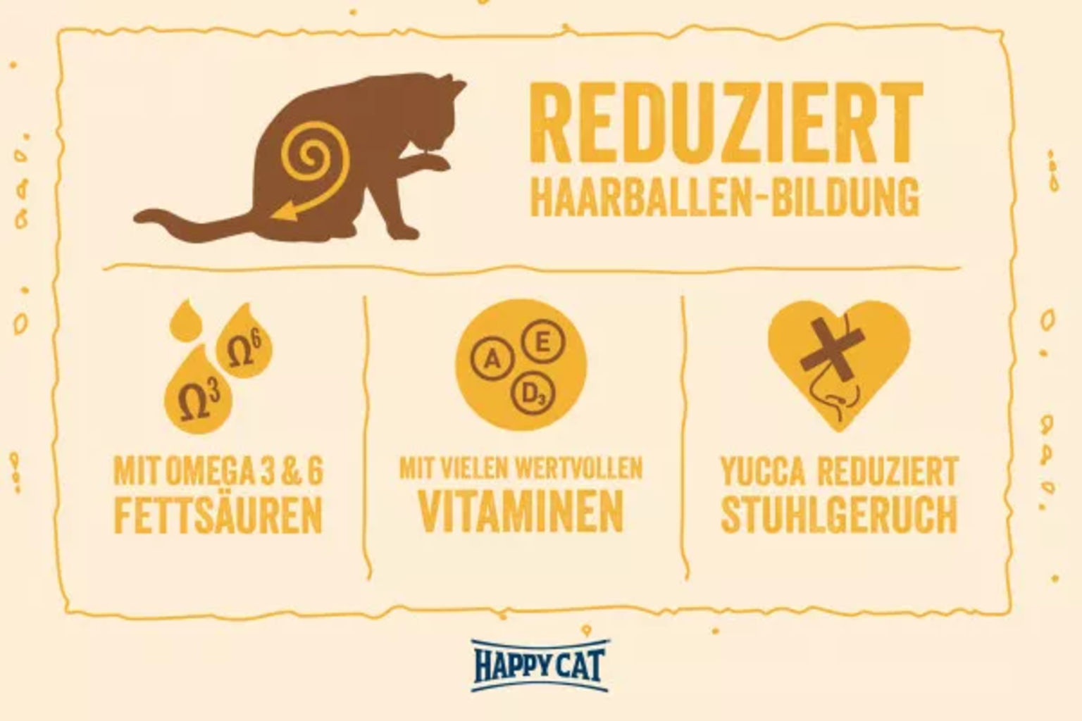 Ces croquettes équilibrées de Happy Cat sont non seulement incroyablement savoureuses, mais leur recette spéciale s'attaque également au problème des boules de poils chez les félins. Ces croquettes contiennent de nombreuses fibres brutes qui peuvent aider à éliminer en douceur les poils avalés lors du toilettage, via le tractus gastro-intestinal. Avec de précieuses vitamines et minéraux ainsi qu'une forte proportion d'acides gras oméga-3 et oméga-6.