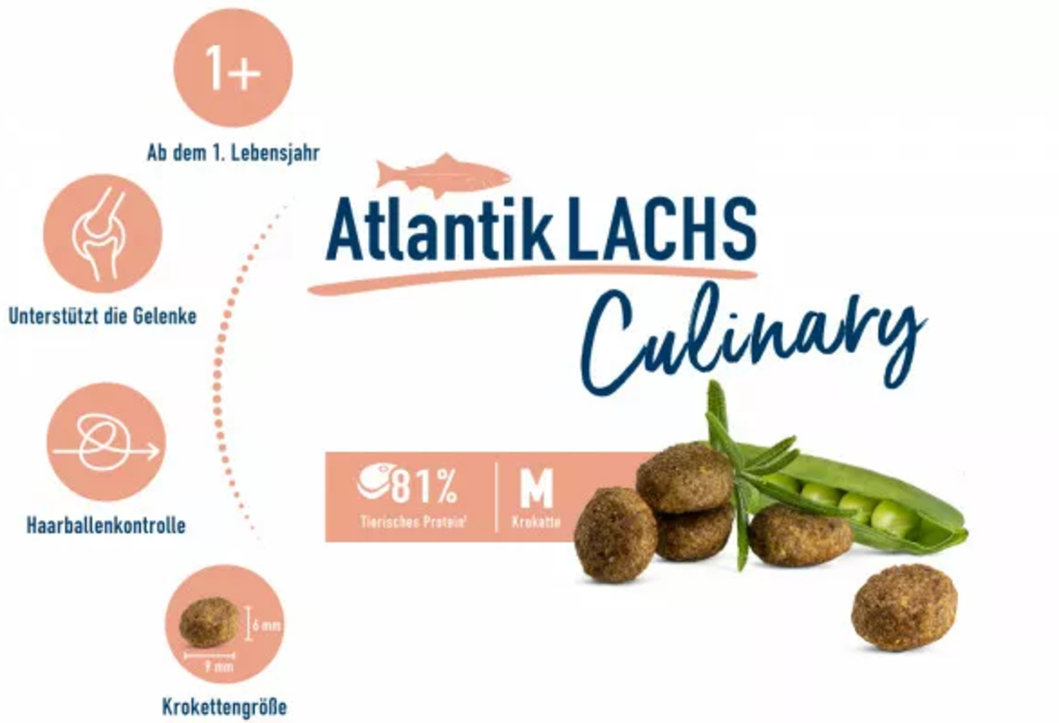 Délicieux saumon de l'Atlantique, délicats petits pois et romarin aromatique – une combinaison à laquelle aucun félin amateur de poisson ne pourra résister. Outre 81 % de protéines animales et de nombreuses vitamines et minéraux précieux, cet aliment contient également d'importantes fibres qui peuvent contribuer à réduire la formation de boules de poils. Avec des acides gras oméga-3 et oméga-6.
