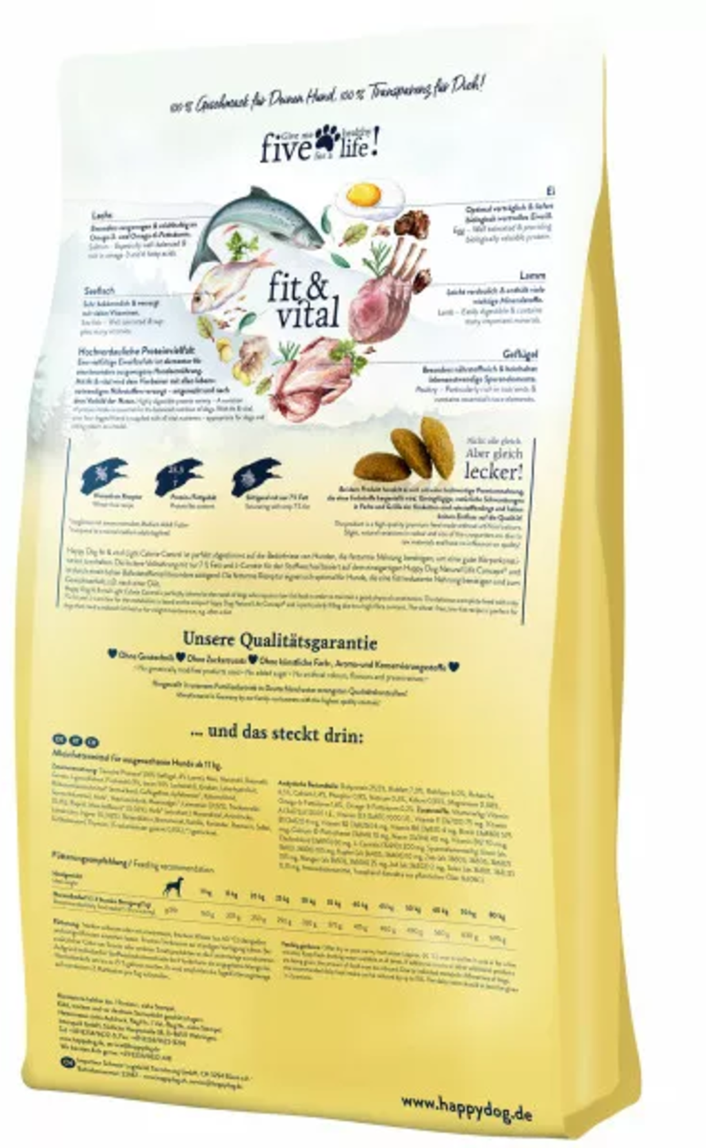 Les croquettes Fit&Vital Calorie Control, pauvres en matières grasses et sans blé, offrent aux chiens légèrement en surpoids des repas à la fois rassasiants et savoureux. La recette équilibrée associe des ingrédients appétissants tels que le saumon, le poisson de mer, les œufs, l’agneau et la volaille, auxquels même les chiens les plus exigeants ne résistent pas.