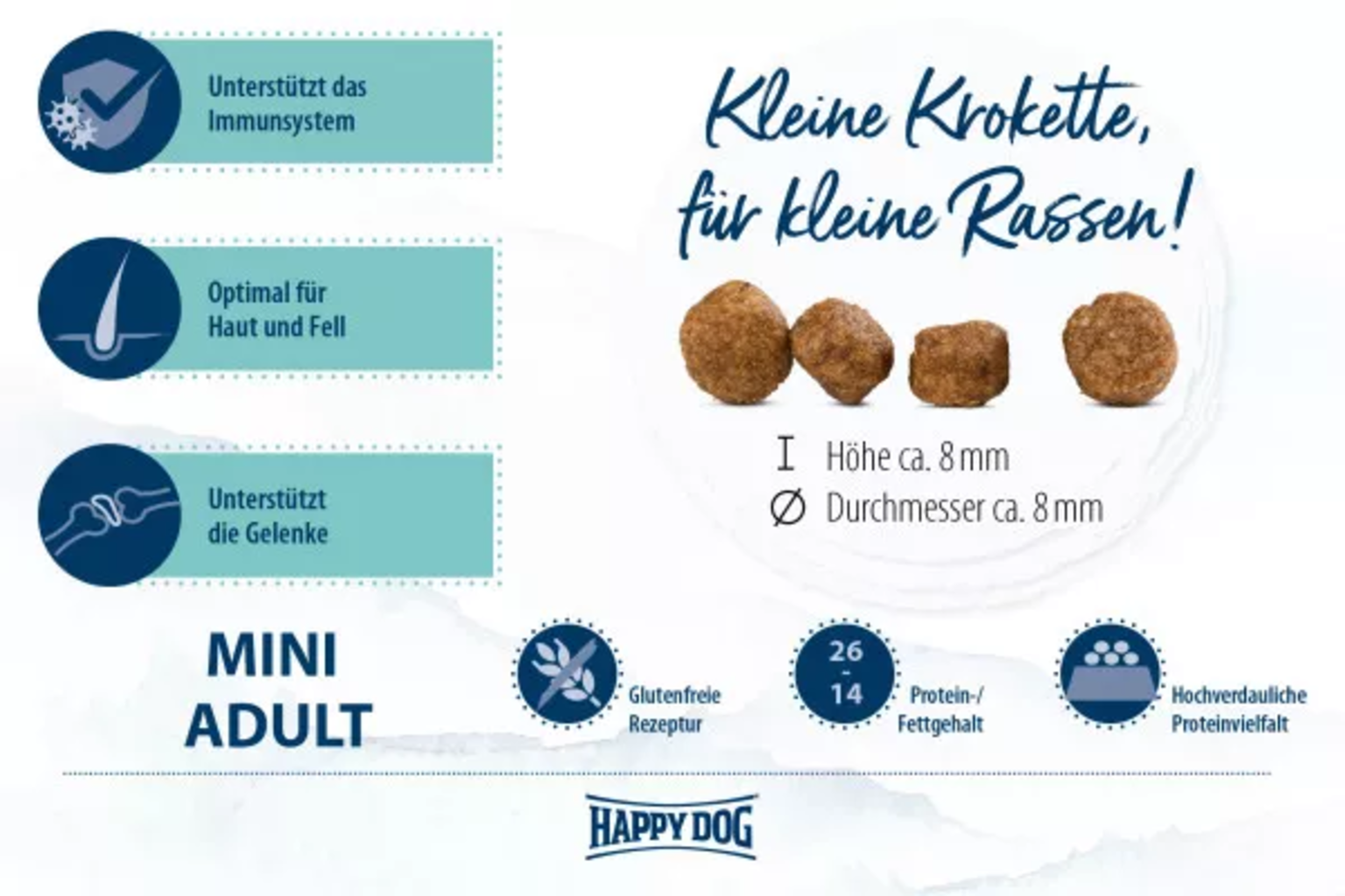 Le saumon est riche en acides gras oméga-3 et oméga-6, tandis que le poisson de mer constitue une source précieuse de vitamines. L’œuf fournit des protéines naturelles, la volaille des oligo-éléments essentiels et l’agneau des minéraux importants. Les petites croquettes de 8 x 8 mm conviennent parfaitement aux chiens de petite taille jusqu’à 10 kg.