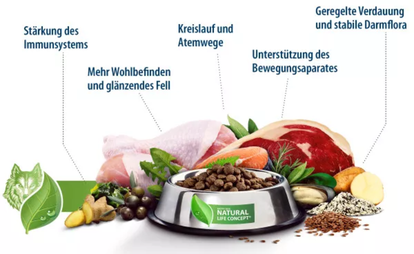 protéine animale (volaille 16 %, agneau 4 %), Farine de maïs, Maïs, huiles et graisses, Orge, cretons, farine de poisson (5 %, dont 50 % farine de saumon), Riz, protéine hydrolysée, pulpe de mélasse de betterave (désucrée), marc de pomme, chlorure de potassium, levure, chlorure de sodium, algues marines, 0,16 % graines de lin, 0,1 % œuf entier déshydraté, chardon-Marie, levure (extraite), 0,02 % chair de moules, Yucca schidigera, artichaut, Löwenzahn, 16 % Gingembre, feuilles de bouleau, ortie, camomille, Coriandre, Romarin, sauge, racines de réglisse, Thymian (herbes séchées, total : 0,15 %)