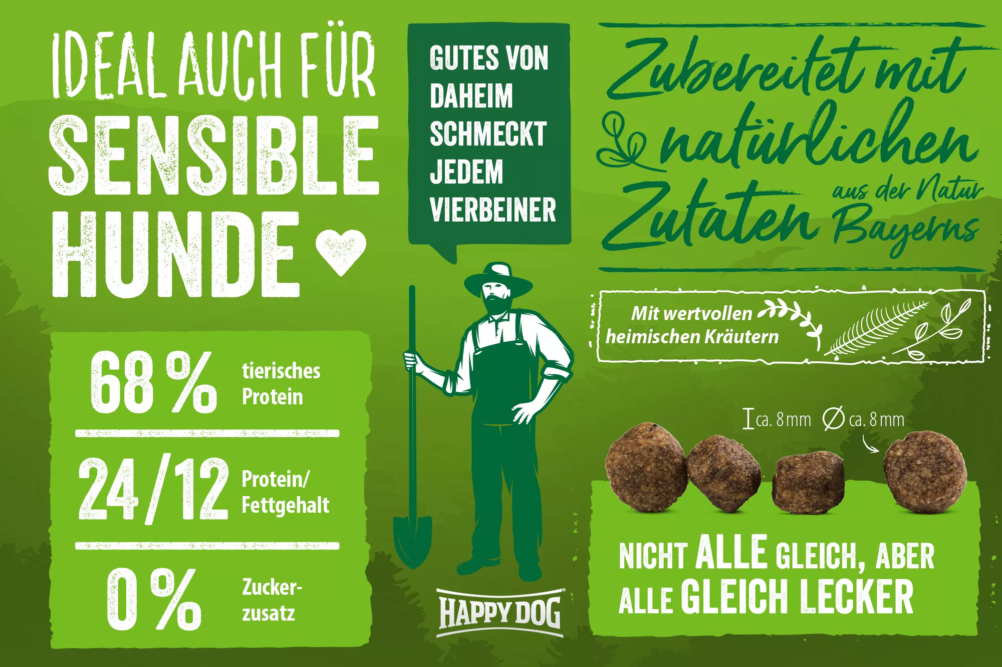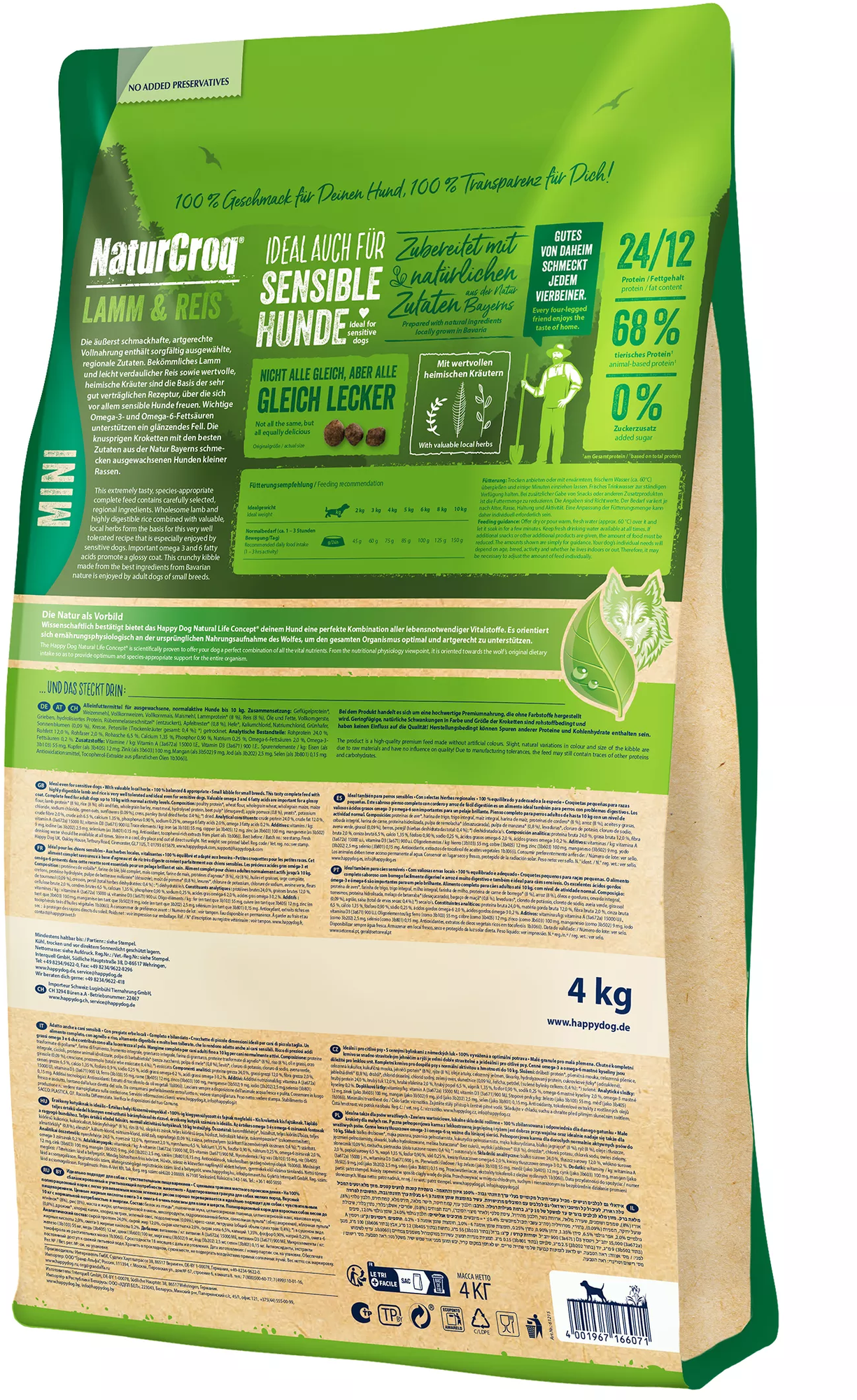 Les croquettes NaturCroq Mini renferment des produits de la région bavaroise. De l'agneau savoureux et du riz complet garantissent un plaisir gourmand et apportent des protéines, des vitamines B et des minéraux essentiels. Cette recette savoureuse est agrémentée d'herbes aromatiques locales sélectionnées.