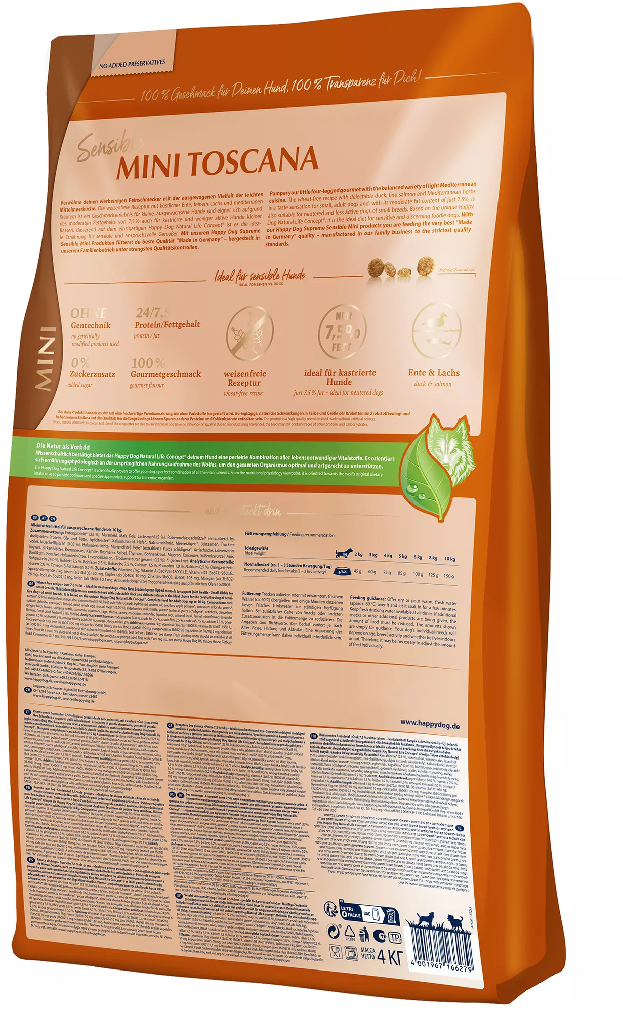 23 % protéines de canard[1], Farine de maïs, Maïs, Riz, 5 % farine de saumon, pulpe de mélasse de betterave (désucrée)[1], protéine hydrolysée, huiles et graisses, marc de pomme[1], chlorure de potassium, levure[1], chlorure de sodium, algues marines[1], graines de lin, œuf entier déshydraté, 0,05 % chair de moules[1], fruits de sureau, chardon-Marie, levure (extraite)[1], Yucca schidigera[1], artichaut, Löwenzahn, Gingembre, feuilles de bouleau, ortie, camomille, Romarin, sauge, Thymian, sarriette, marjolaine, Coriandre, racines de réglisse, anis, Basilic, Fenouil, fleurs de sureau, Fleurs de lavande