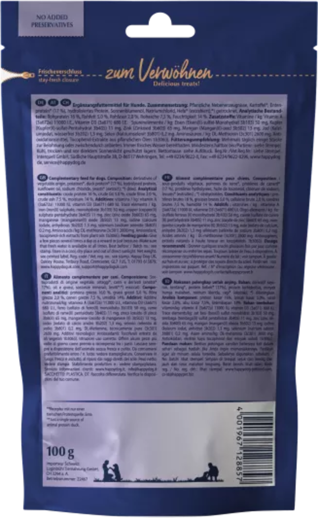Ce snack moelleux en forme de cœur présente une recette sans sucre ni céréales, adaptée aux chiens souffrant d’intolérances alimentaires. Cette délicate gourmandise séduit par sa savoureuse viande de canard et ses pommes de terre sans gluten.