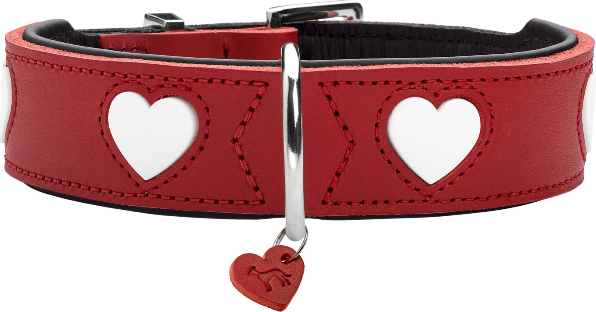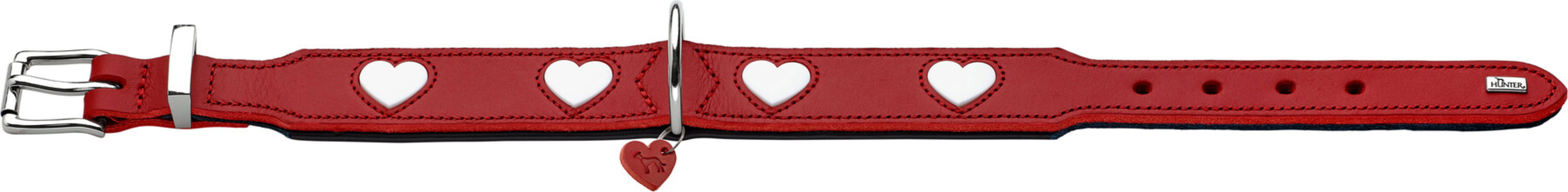 Le collier "Love" tendance de HUNTER réunit une passion pour la perfection artisanale, des matériaux de grande qualité et un design unique : le dessus et le dessous sont en cuir de vache, doublé d'un cuir nappa de vache particulièrement doux. Les cœurs sont fabriqués à la main par une manufacture de Bielefeld et sont bordés et cousus individuellement.