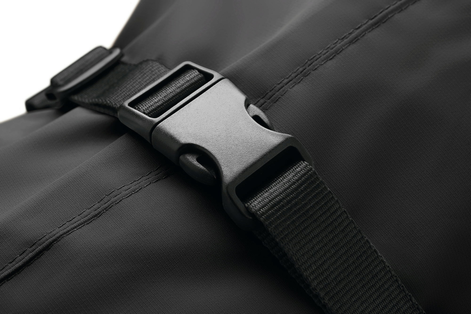 La largeur du col est ajustable grâce à un élastique, et une ouverture pour l'anneau en D permet de l'attacher et de le détacher sans effort. Pour être prêt à partir en un rien de temps : une ceinture ventrale réglable en continu avec fermeture à clic au dos rend le manteau très facile à ajuster, ainsi qu'à enfiler et à retirer.