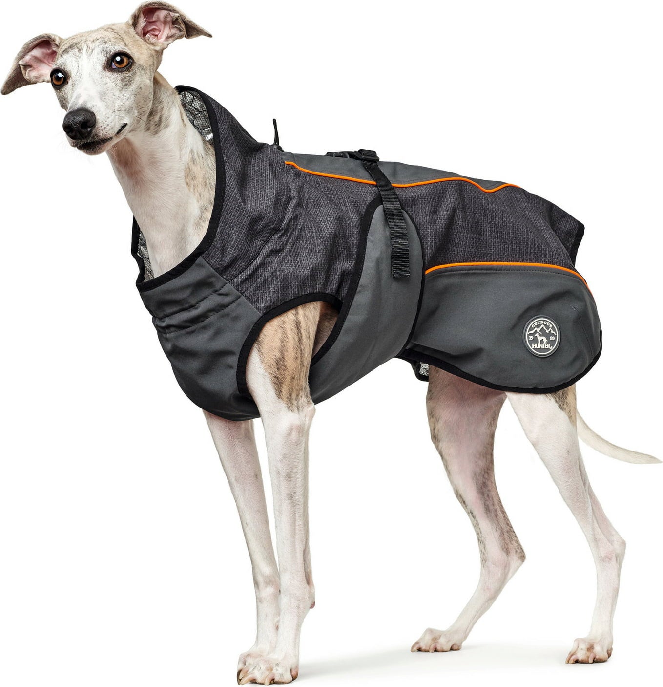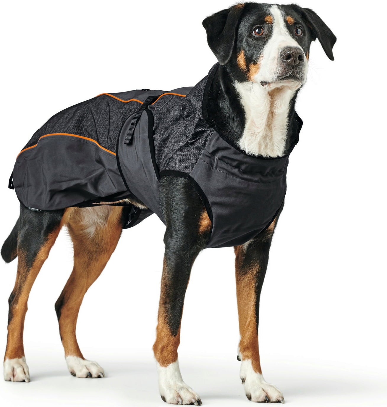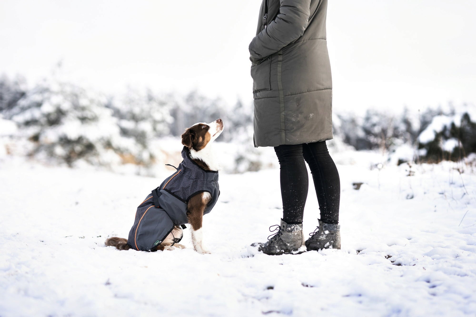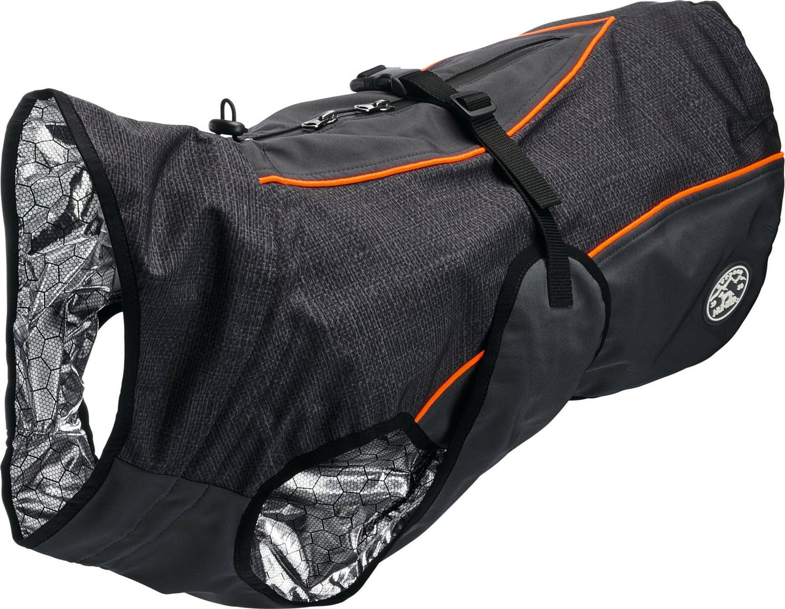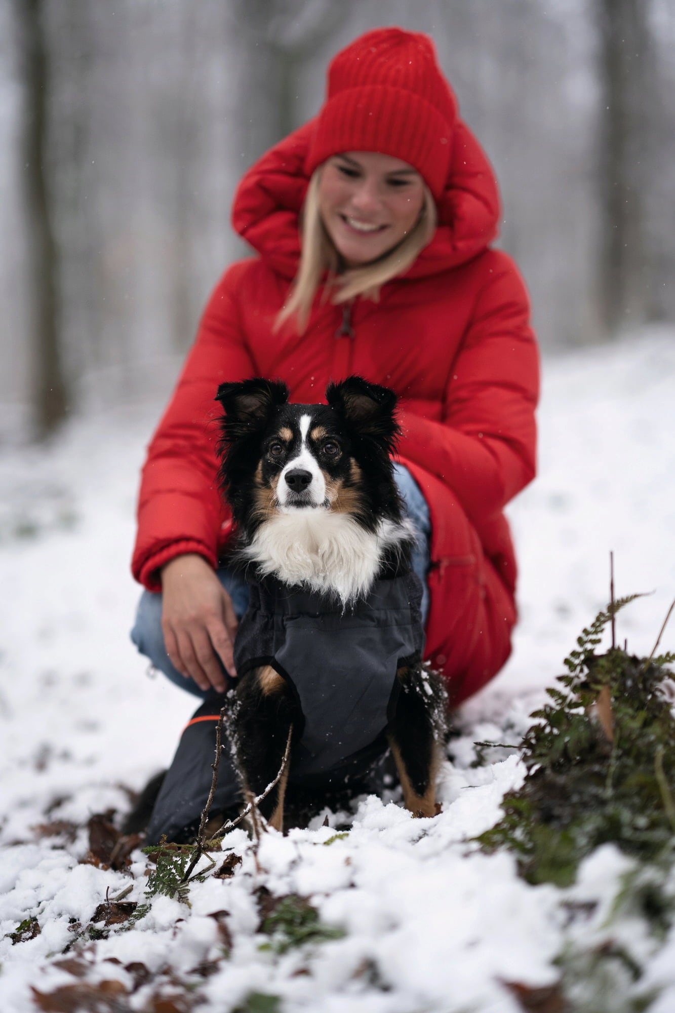 Des élastiques pour les pattes arrière optimisent le maintien du manteau, quelle que soit la morphologie du chien, et sans jamais limiter sa liberté de mouvement. Tous les passepoils sont en tissu réfléchissant afin d'assurer plus de sécurité lors de mauvaises conditions lumineuses.